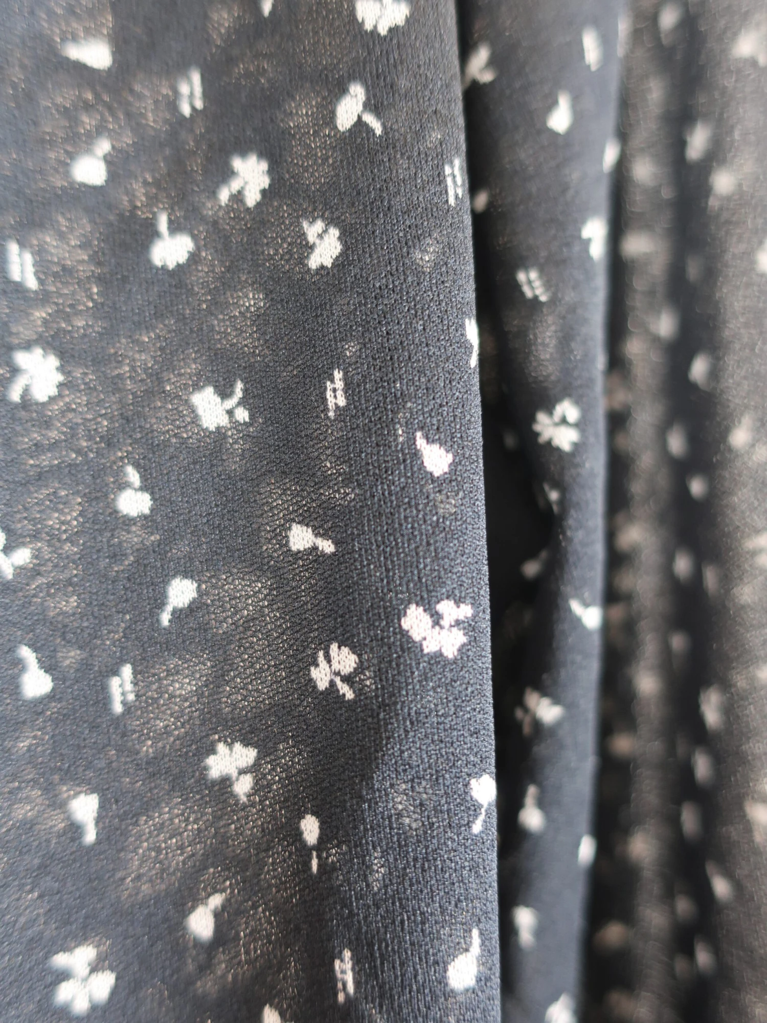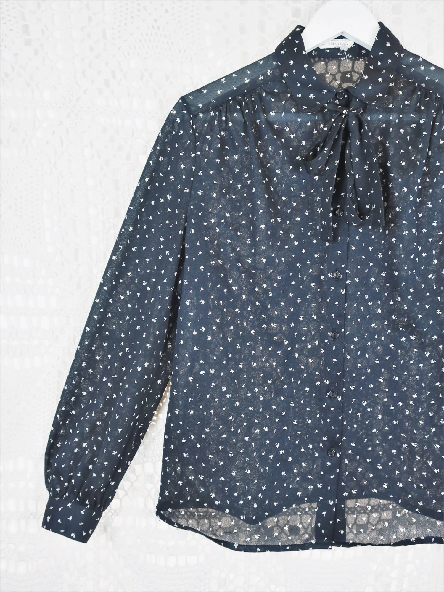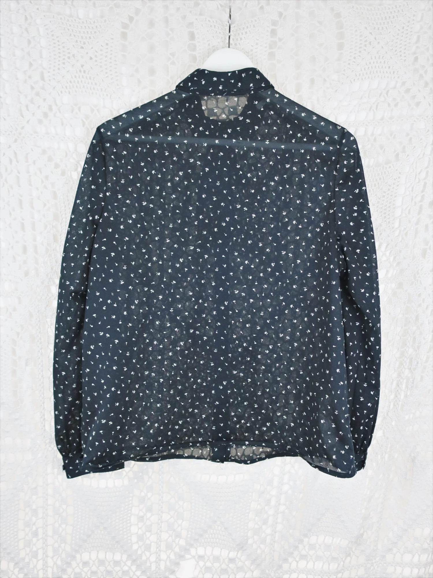 Cute vintage 1970’s sheer black shirt with small white flowers on and a bow that ties at the neck. Would look fab with a pair of jeans!