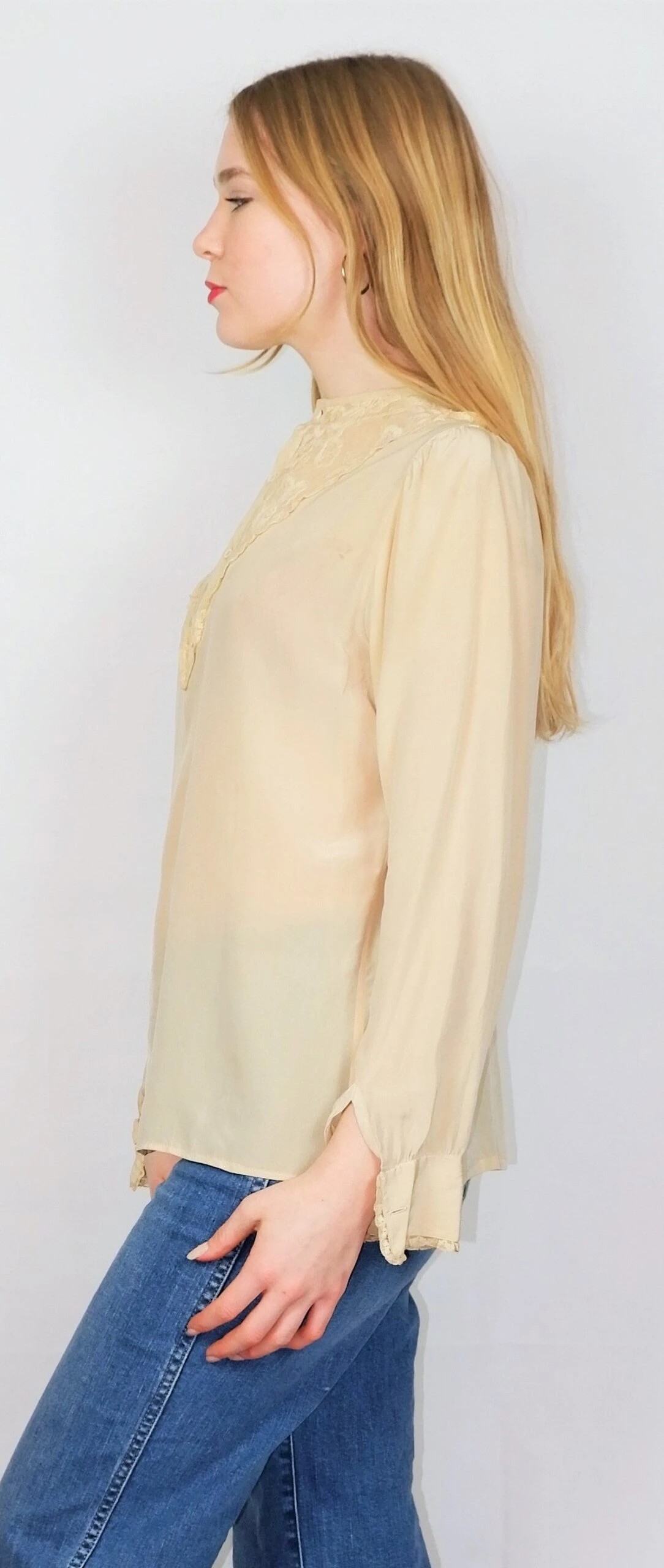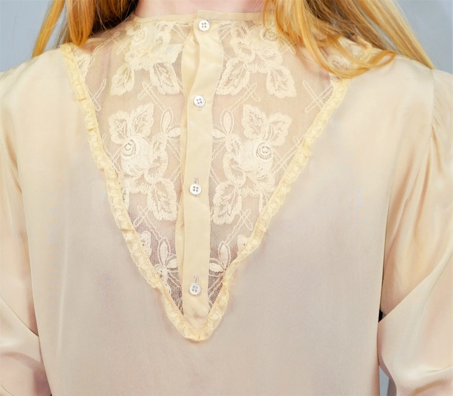 Absolutely gorgeous vintage silk blouse with a half button neck and sheer floral lace panels on the bust and back