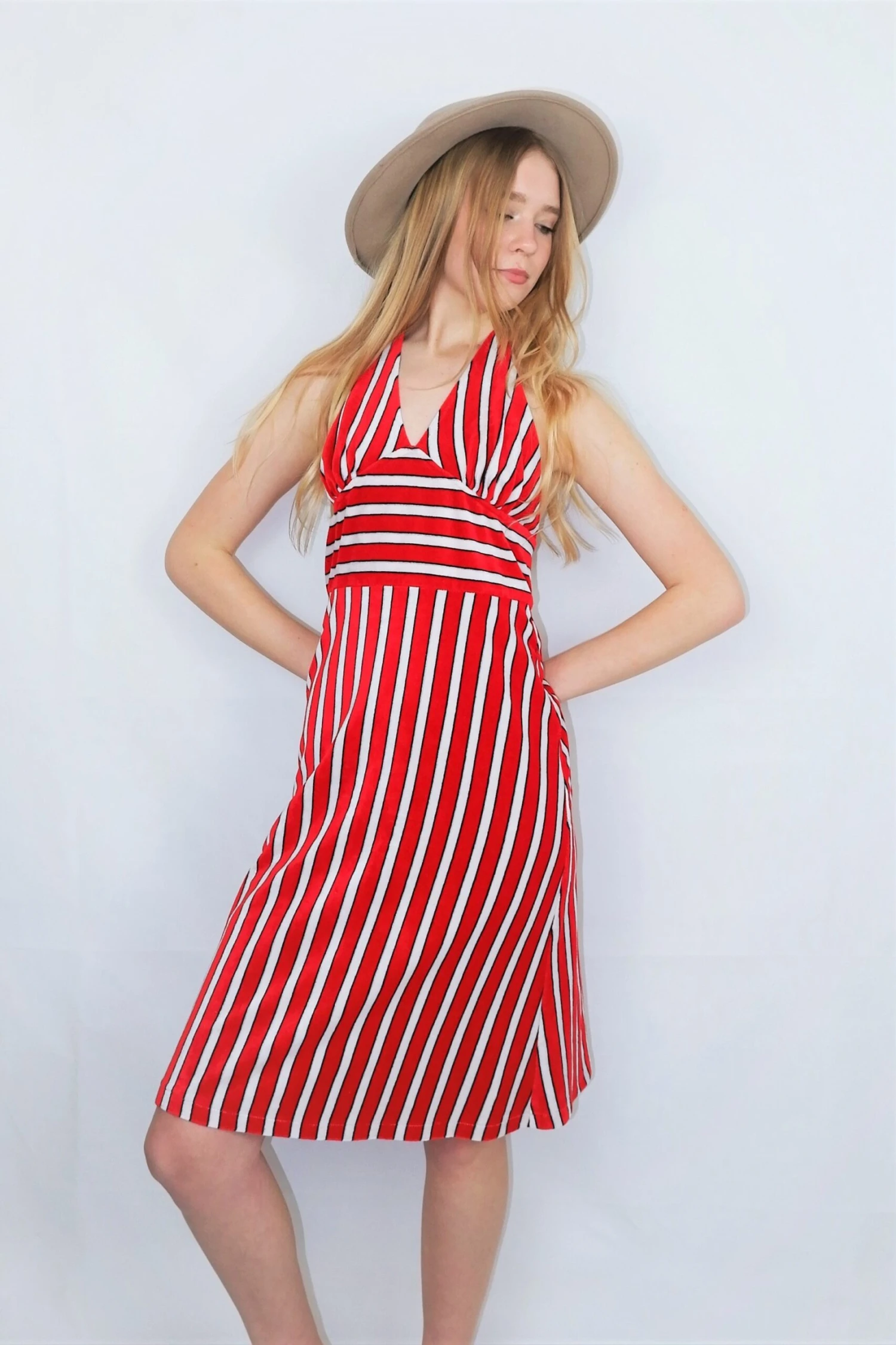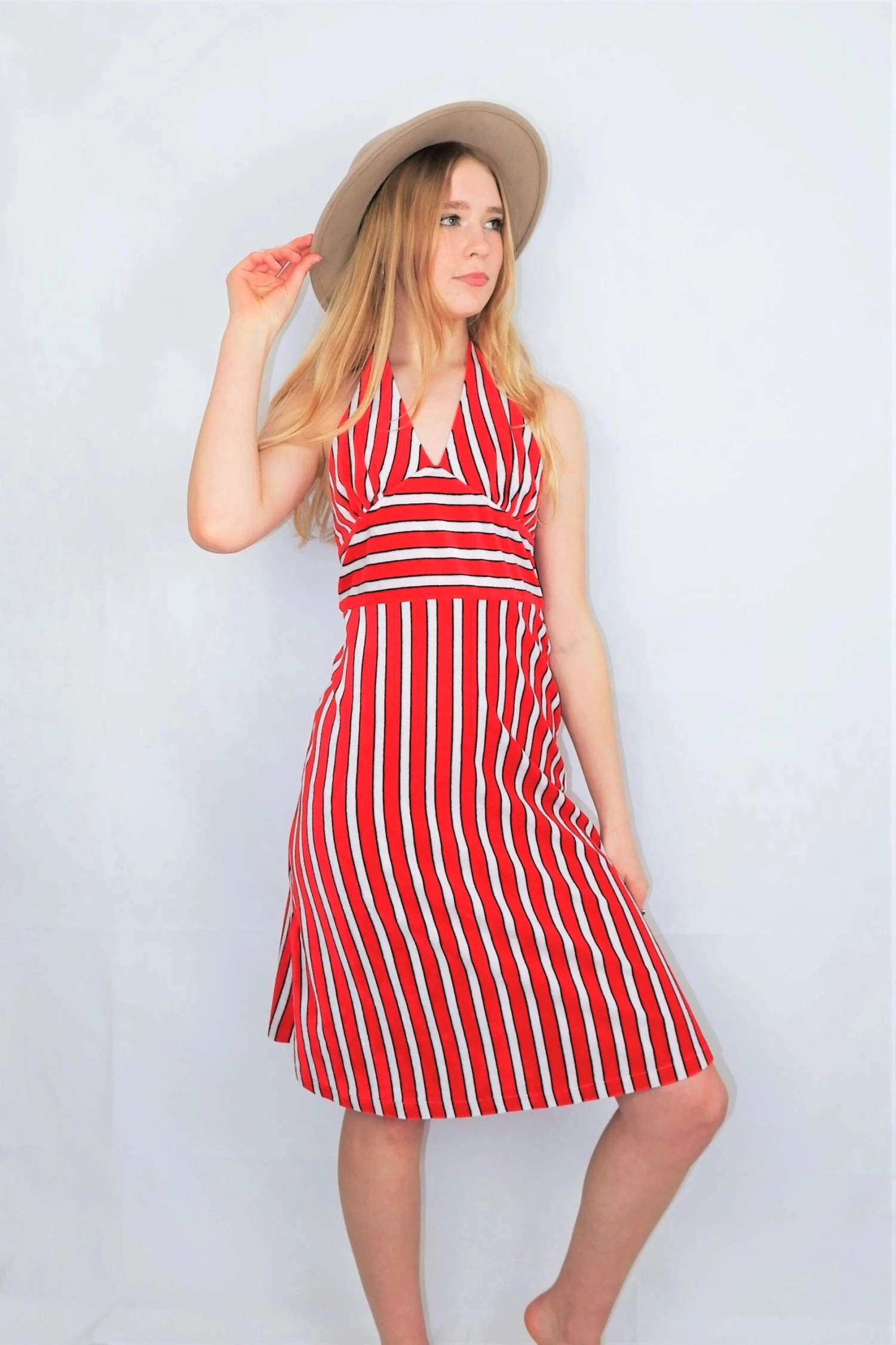 Retro and fun velour strappy sundress with a floaty skater skirt and fitted strappy bodice. Great for hot days and festivals or dressed up as evening wear.