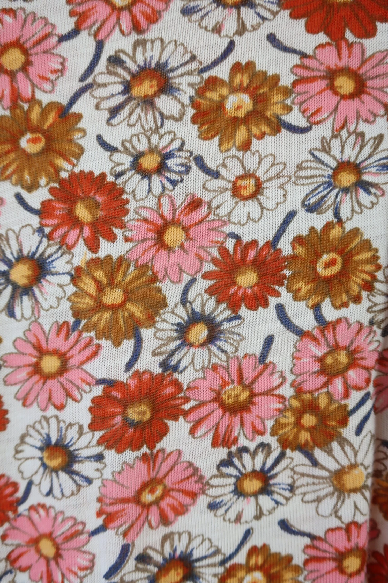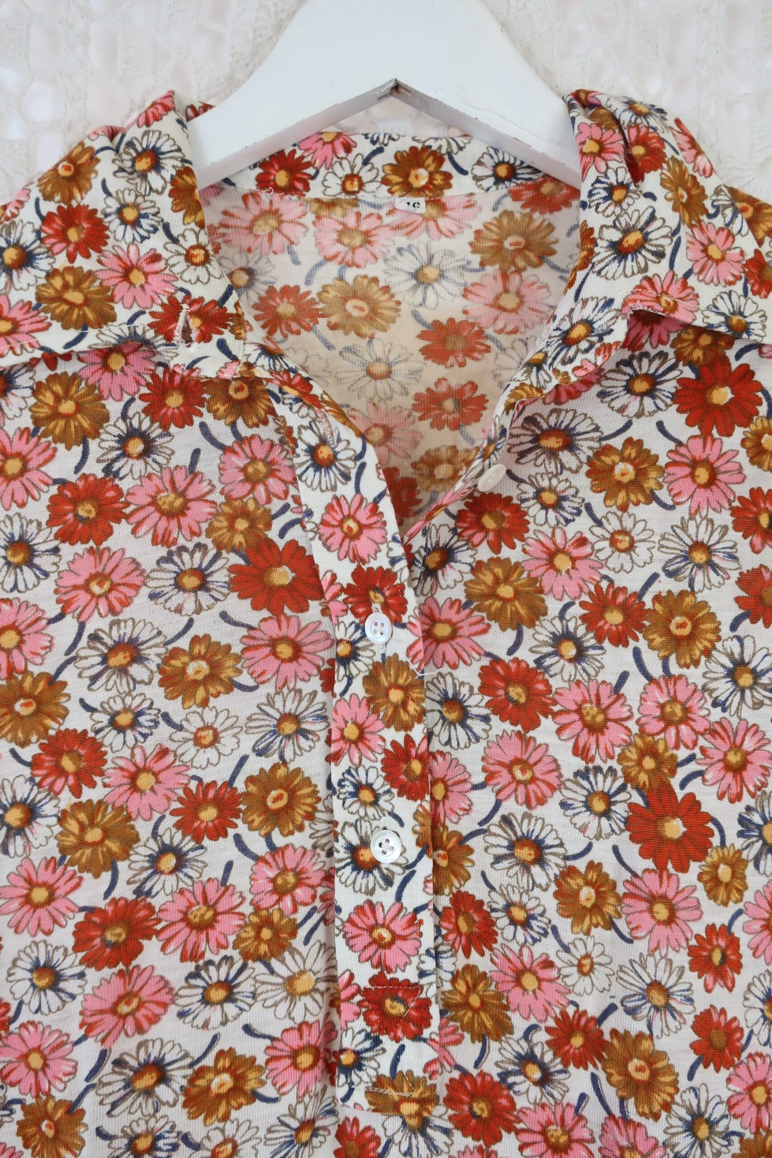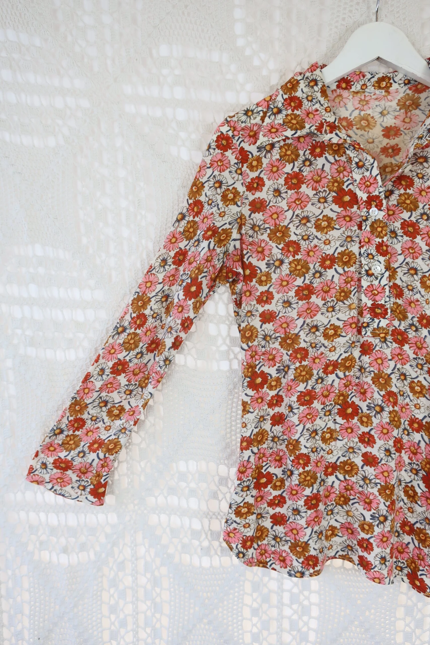 Gorgeous vintage 1970’s floral shirt in black with a cute brown, pink and orange floral print and a pointed collar. The buttons run halfway down the front – very flattering fit!