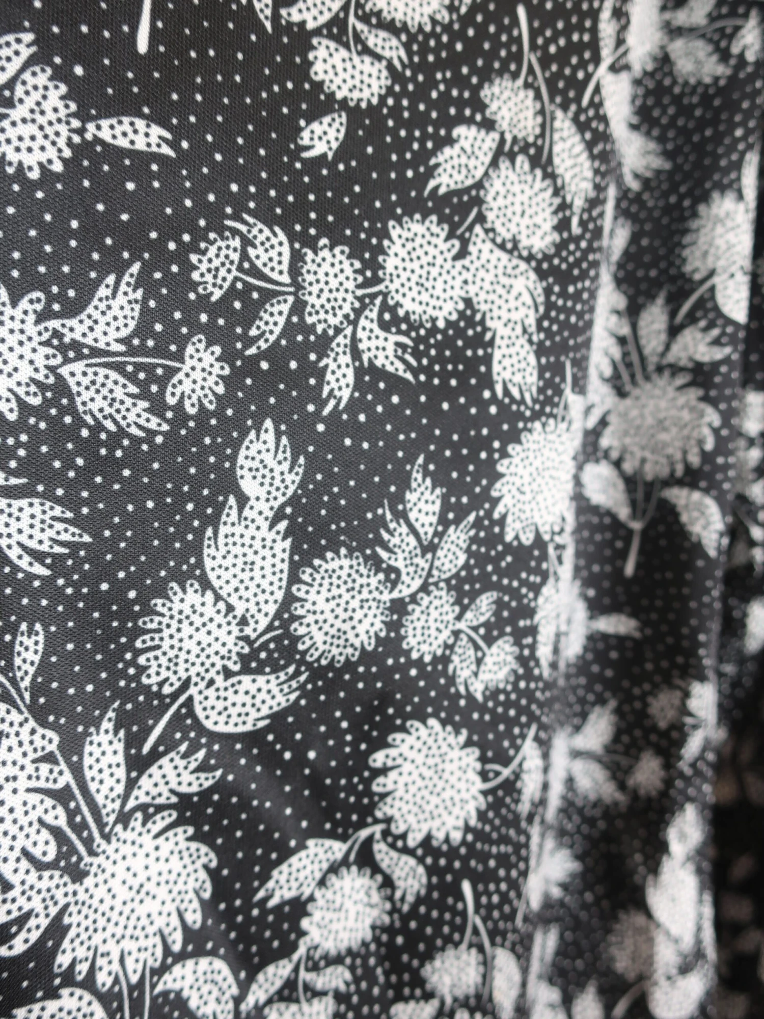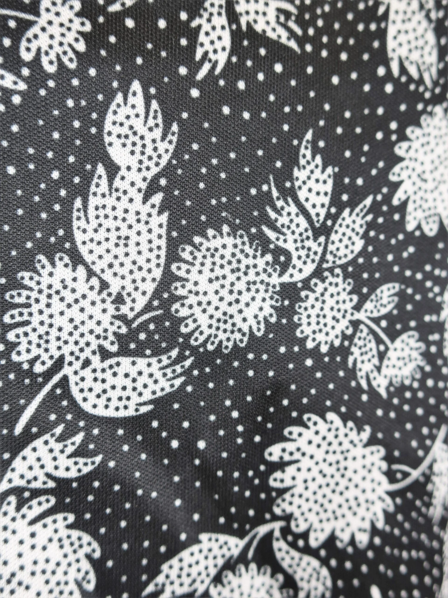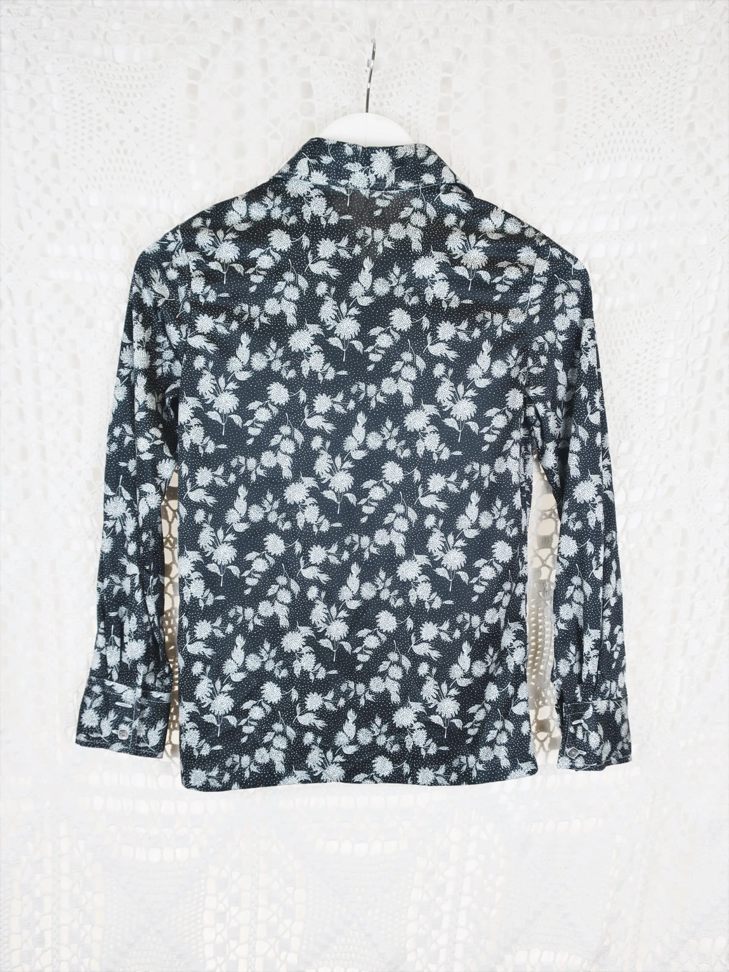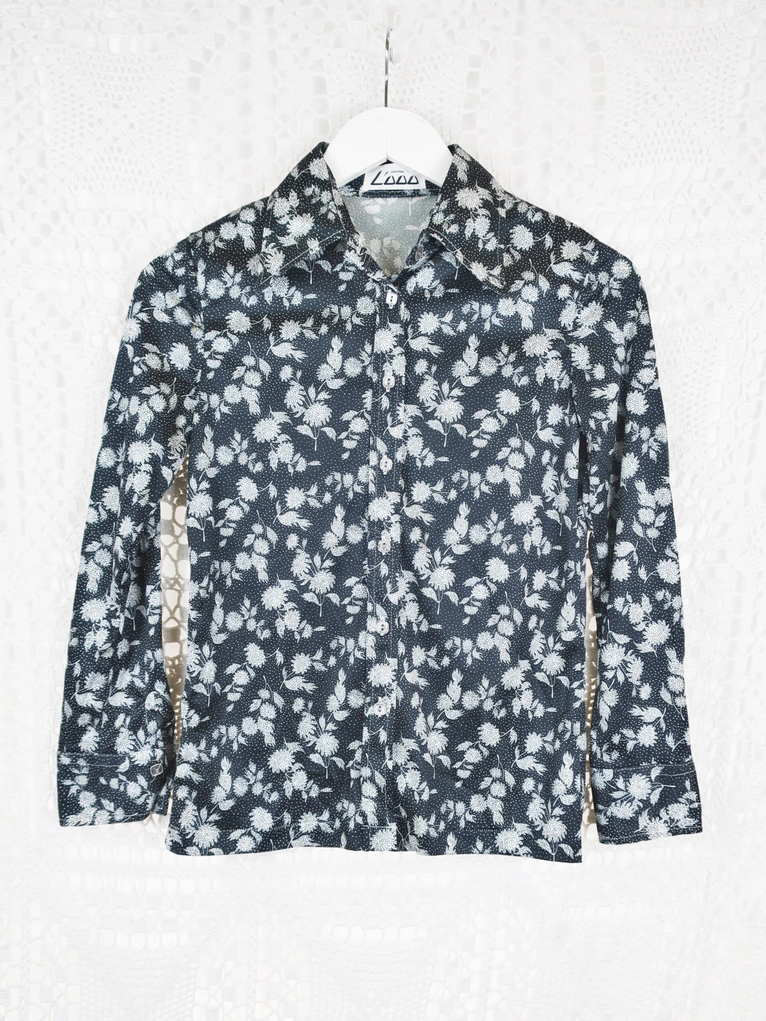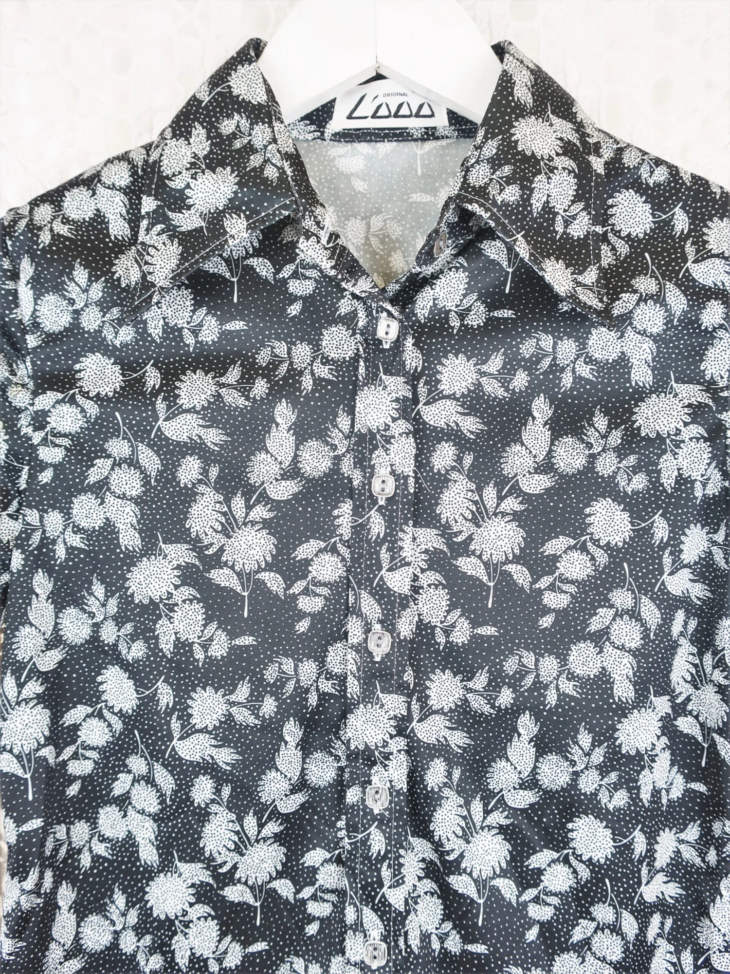 Cute 1970’s vintage Flower-Power Floral shirt in black and white with dotted detail and has a pointed collar.ย