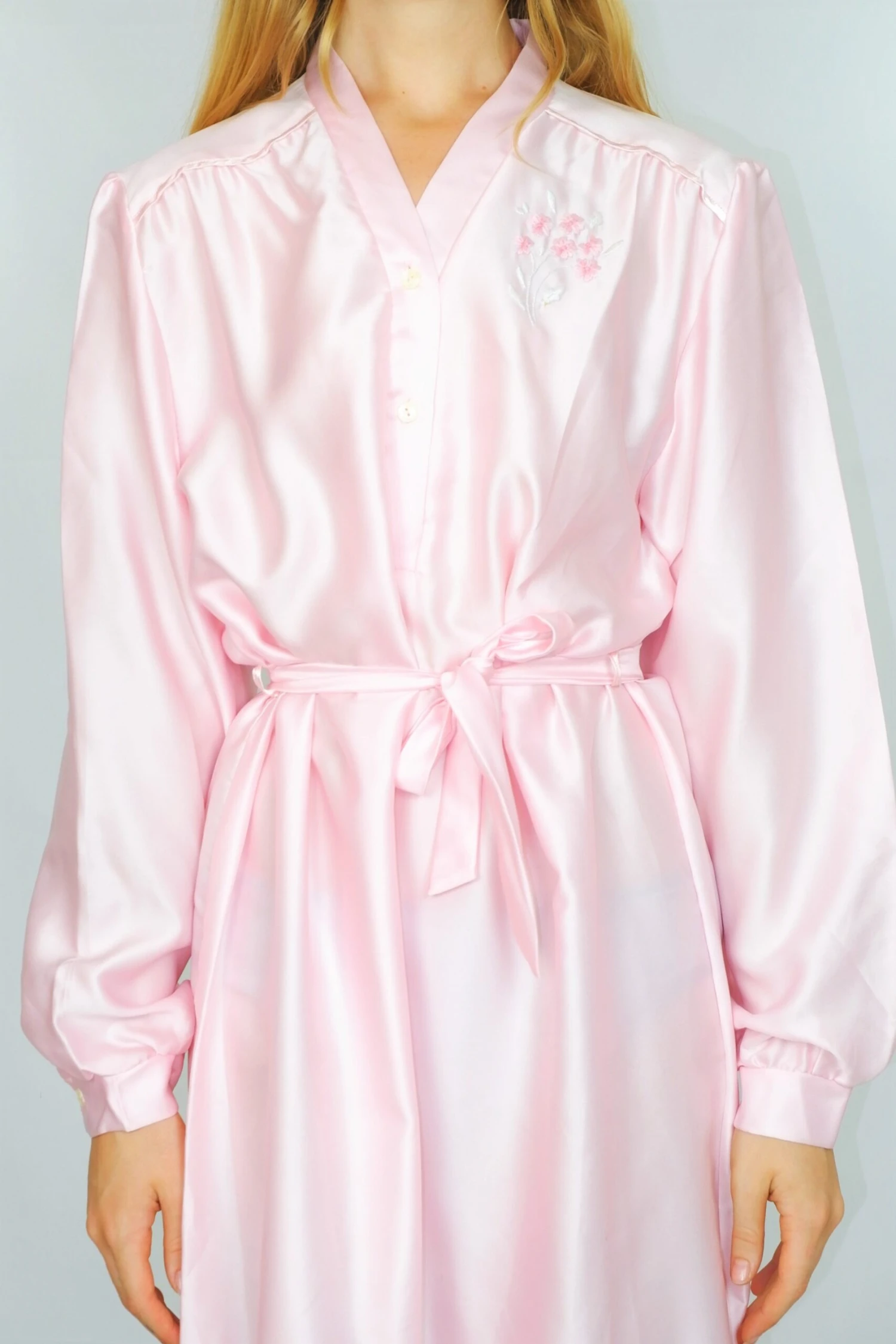 Very gorgeous vintage 70’s nightdress in a lovely baby pink colour with a cute ditsy floral embroidery on the left breast and waist tie. Would look gorgeous in summer with a hat and sandals!