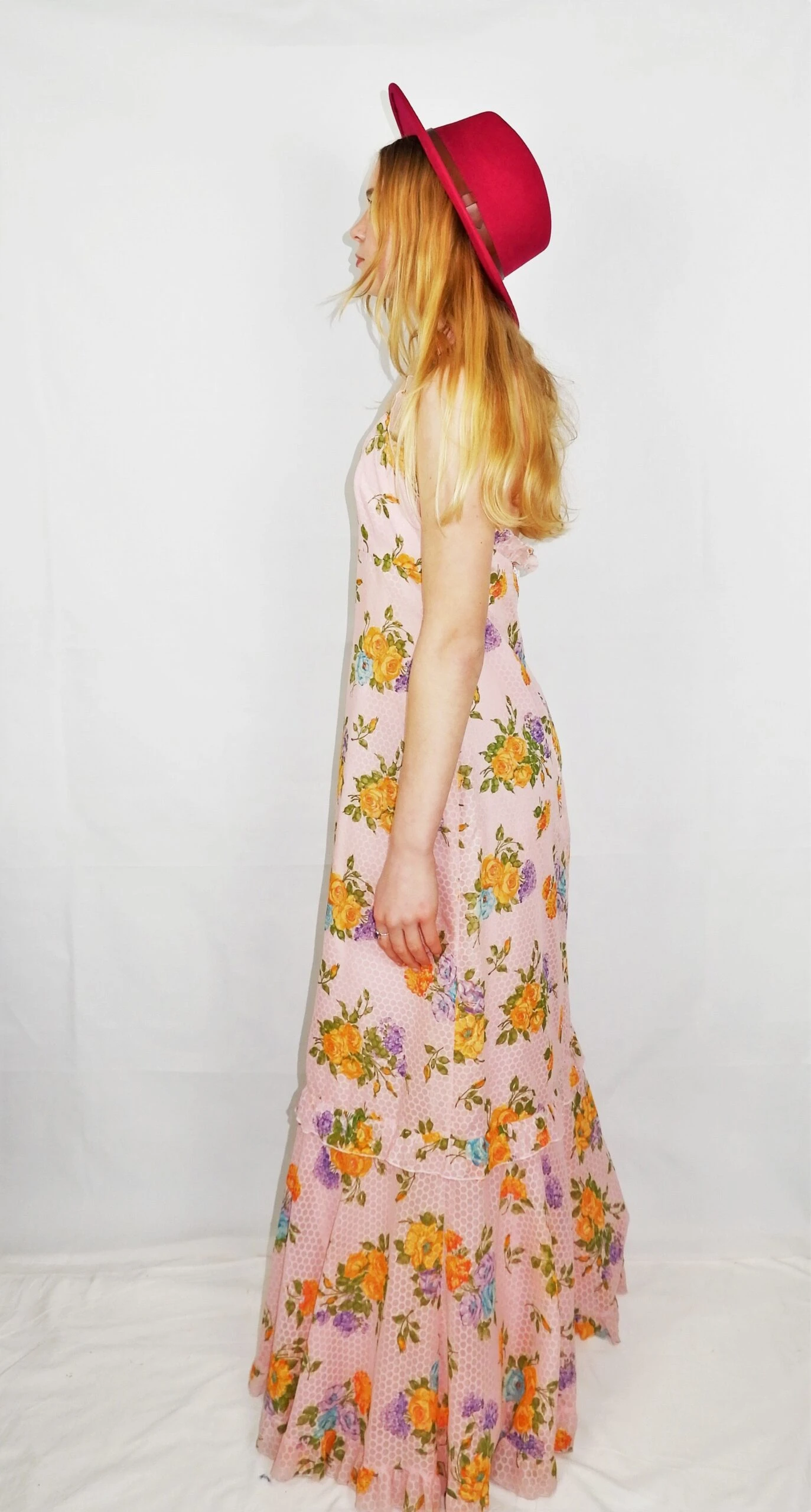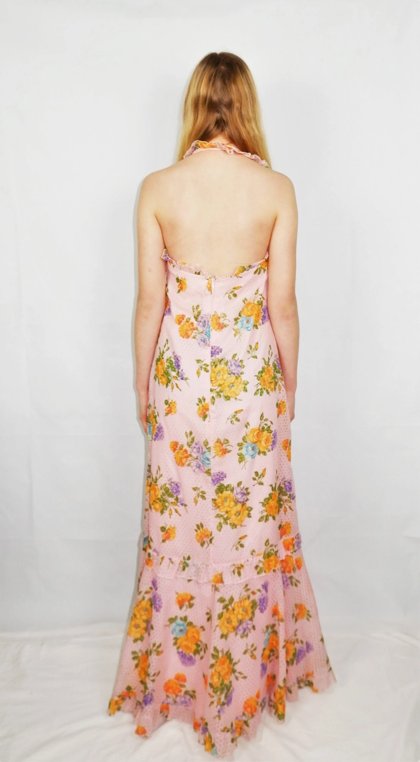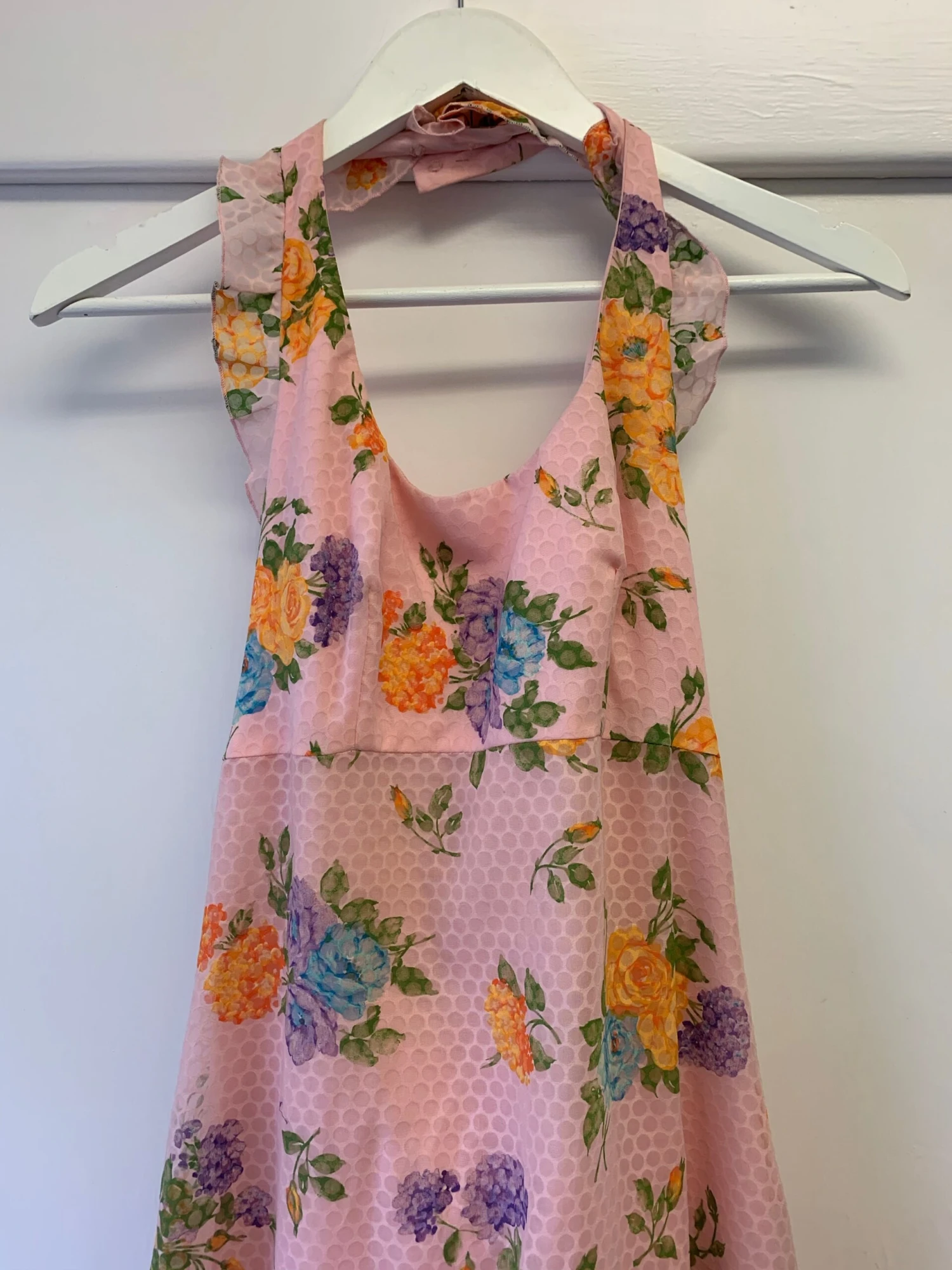 Pretty pink halter-neck dress, with a painted floral design and frills around the neckline and skirt. Would make a lovely party dress!