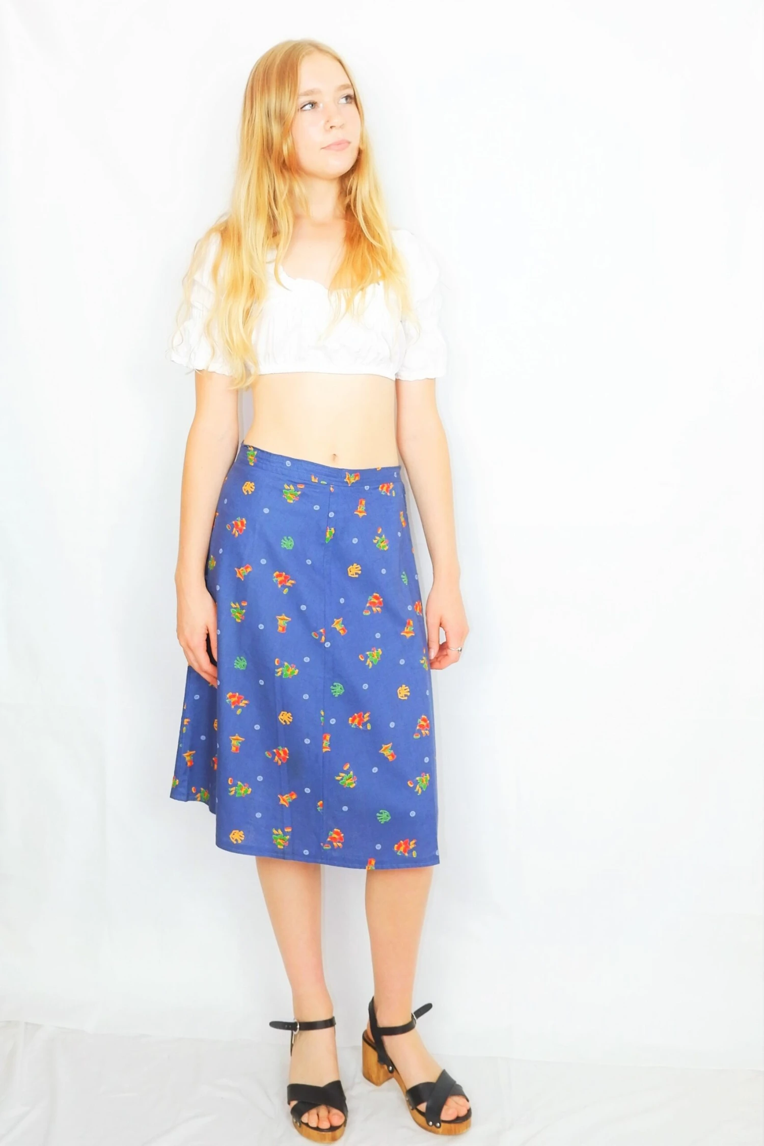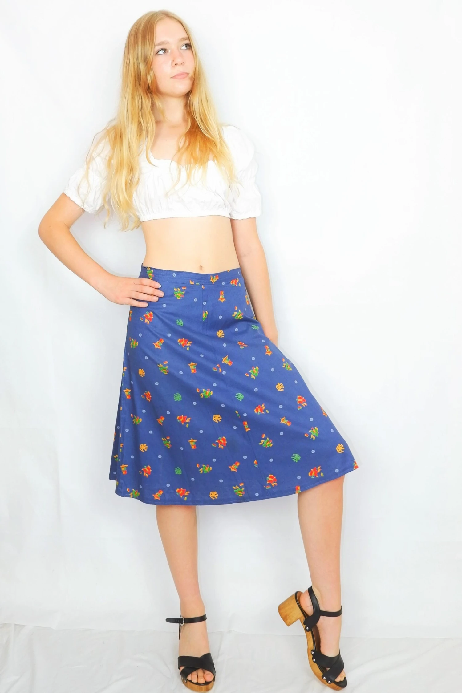 Vintage 70s midi skirt in an easy to wear & staple shade of blue, with an intriguing graphic illustration!