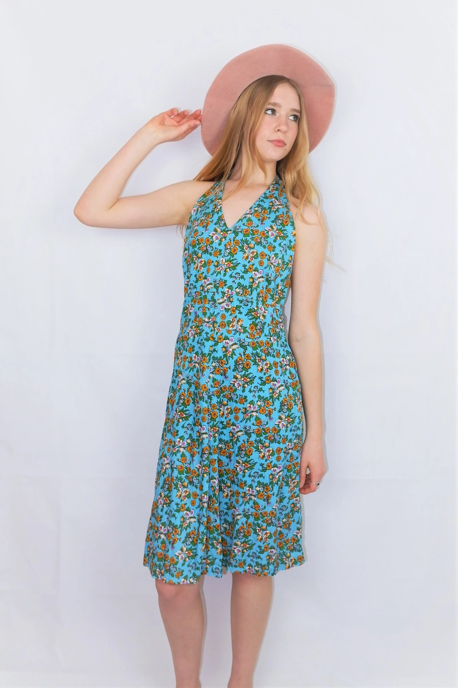 Really pretty strappy sundress with a vibrant ditsy floral print. Perfect for hot days paired with some boots or dressed up as eveningwear.
