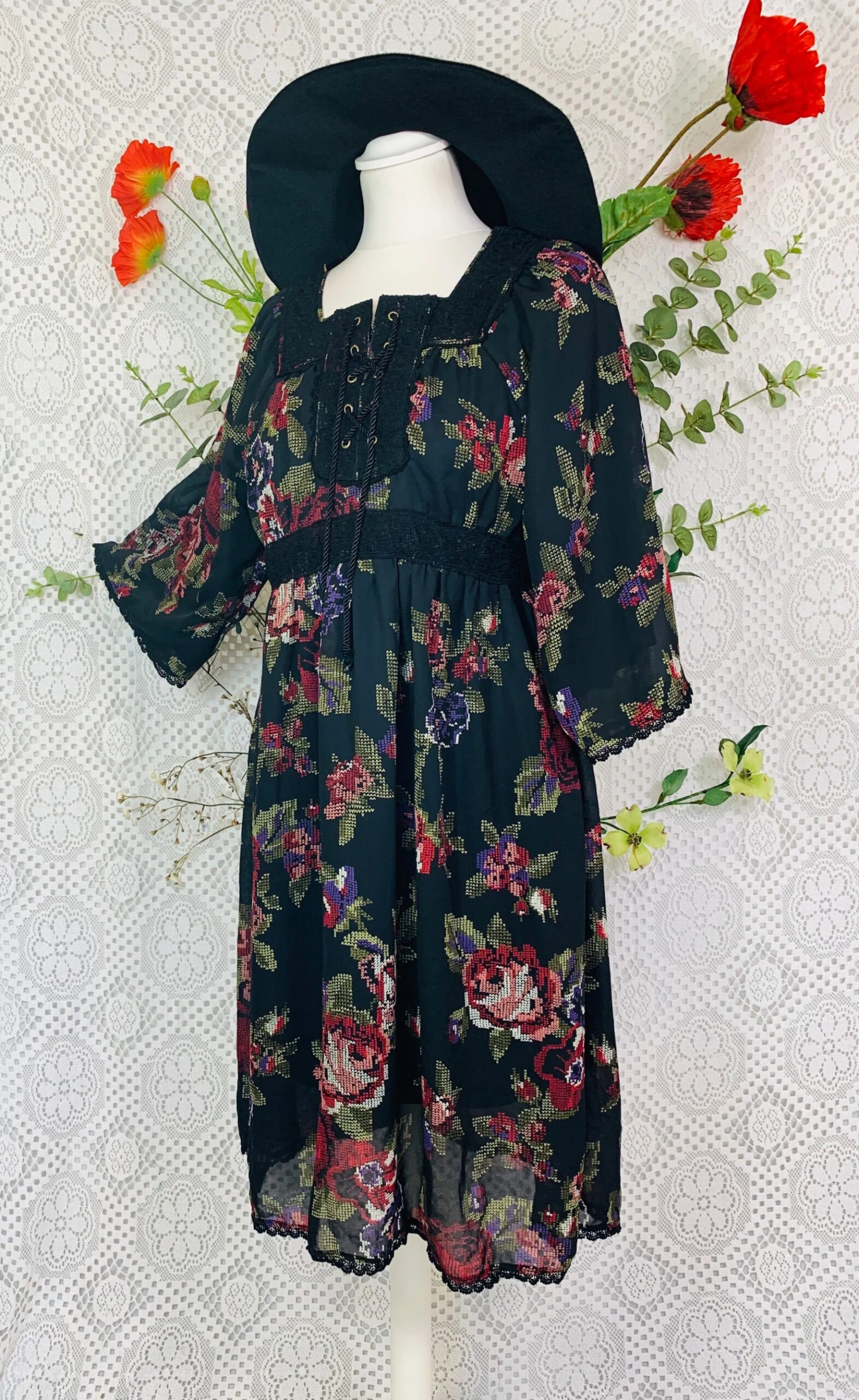 Vintage chiffon dress with lace and floral printย