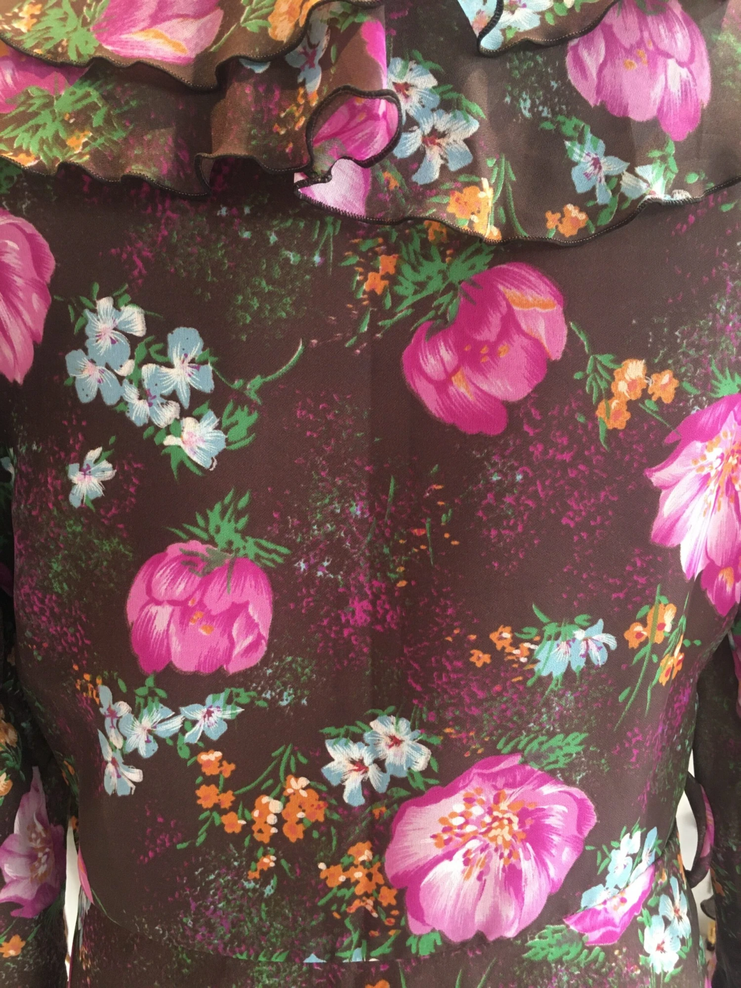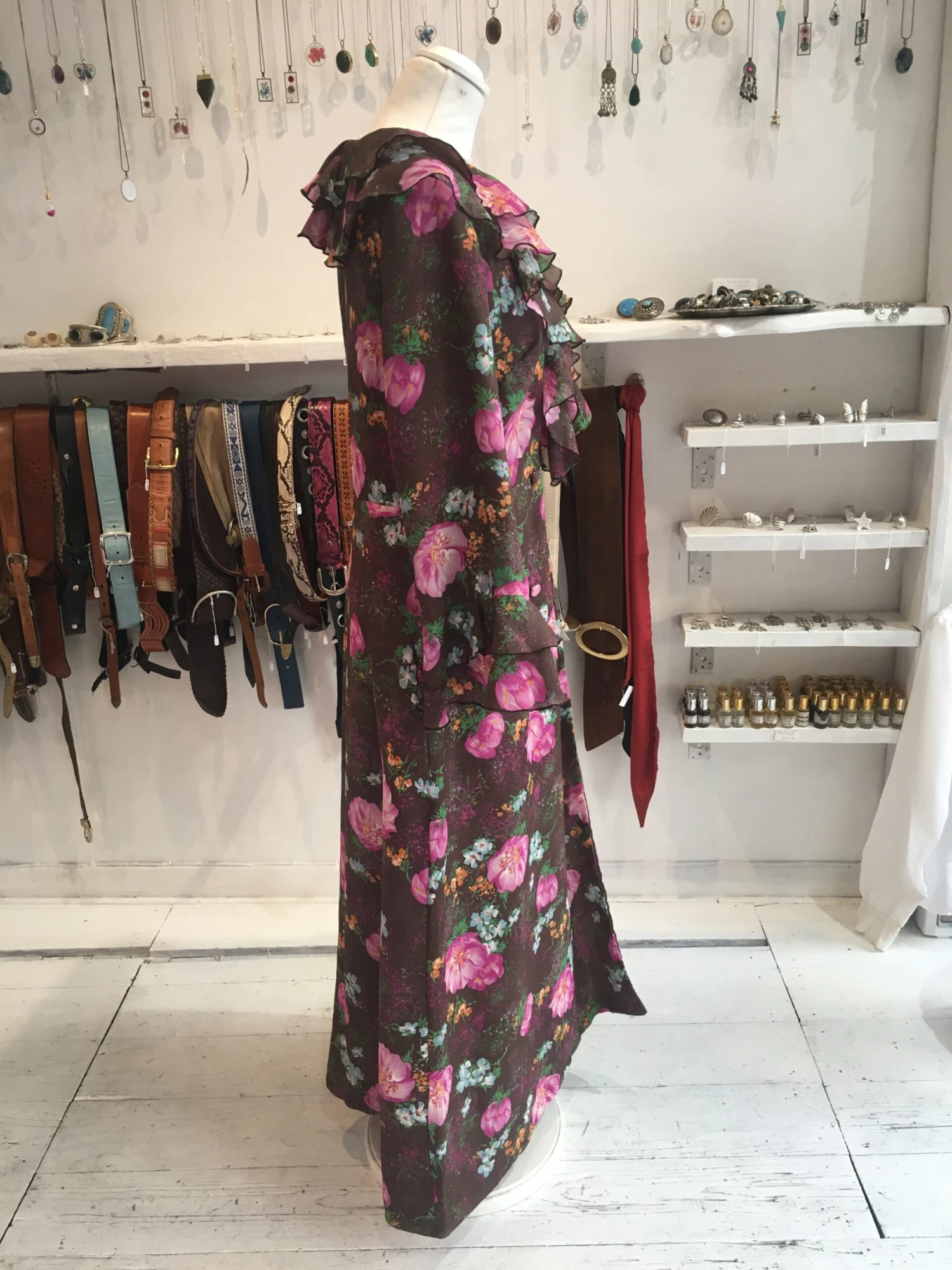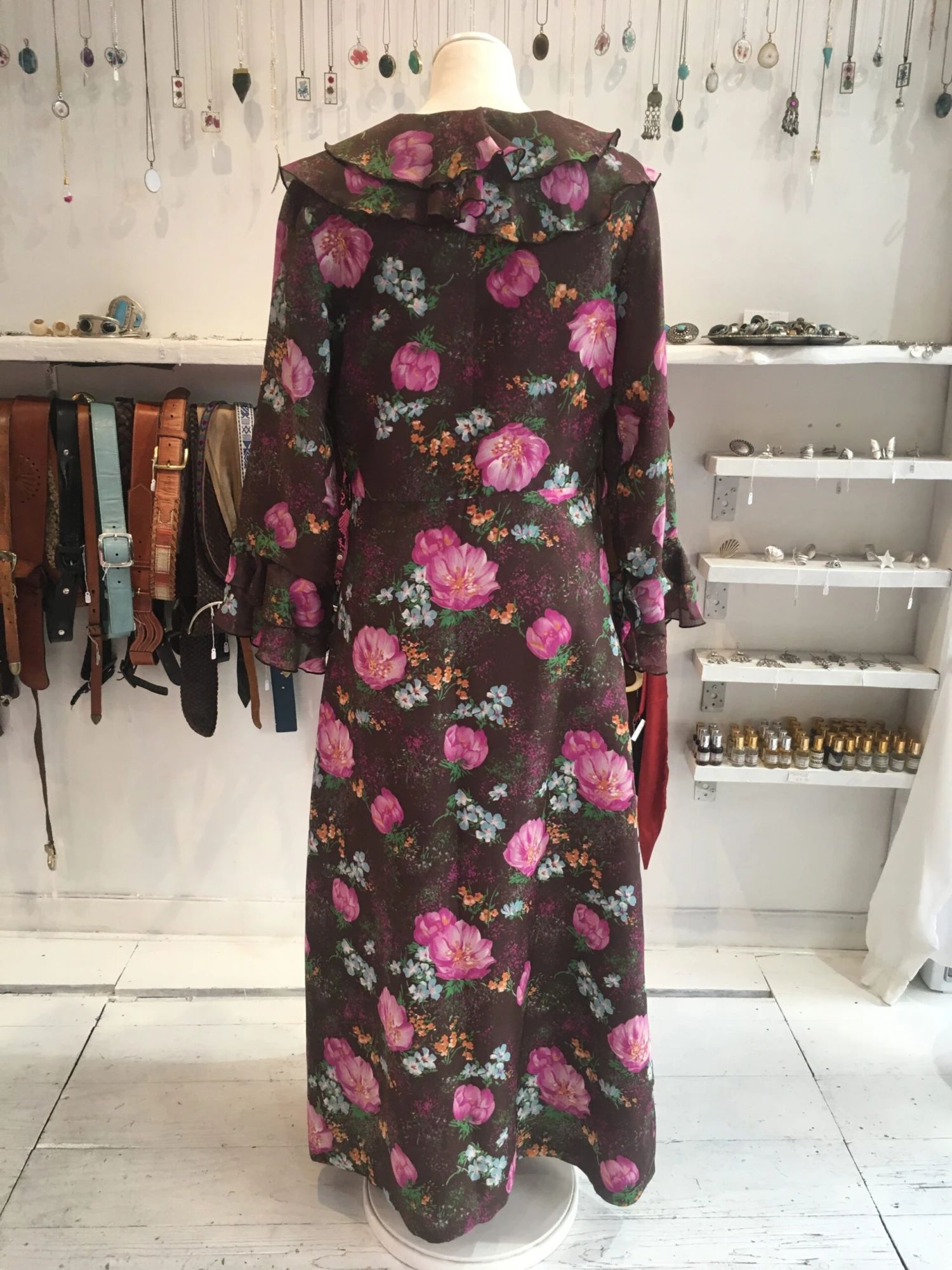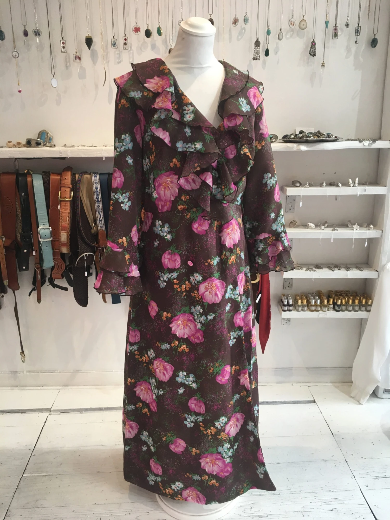 Fabulous frilly vintage housecoat. With a lovely deep maroon colour and floral print!