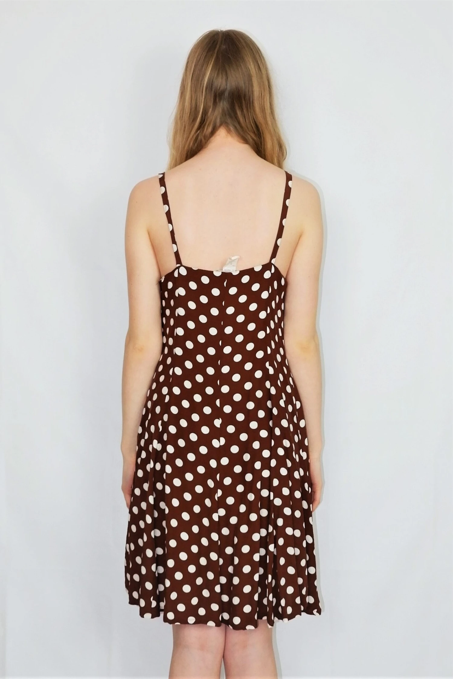 Super cute vintage strappy dress. The perfect length for summer, the joyful polka dots and button up design makes dress feel youthful and fun.