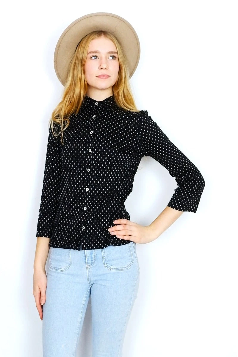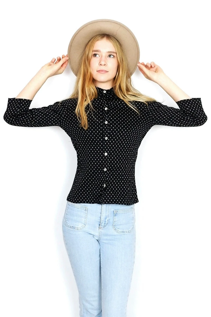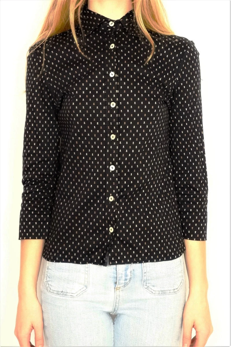 Retro cotton shirt with a slight 70s fitted shape and what looks to be a fun castle chess piece print. Perfect for a lover of the game! Three quarter length sleeves and ideal for dressing up or down!ย