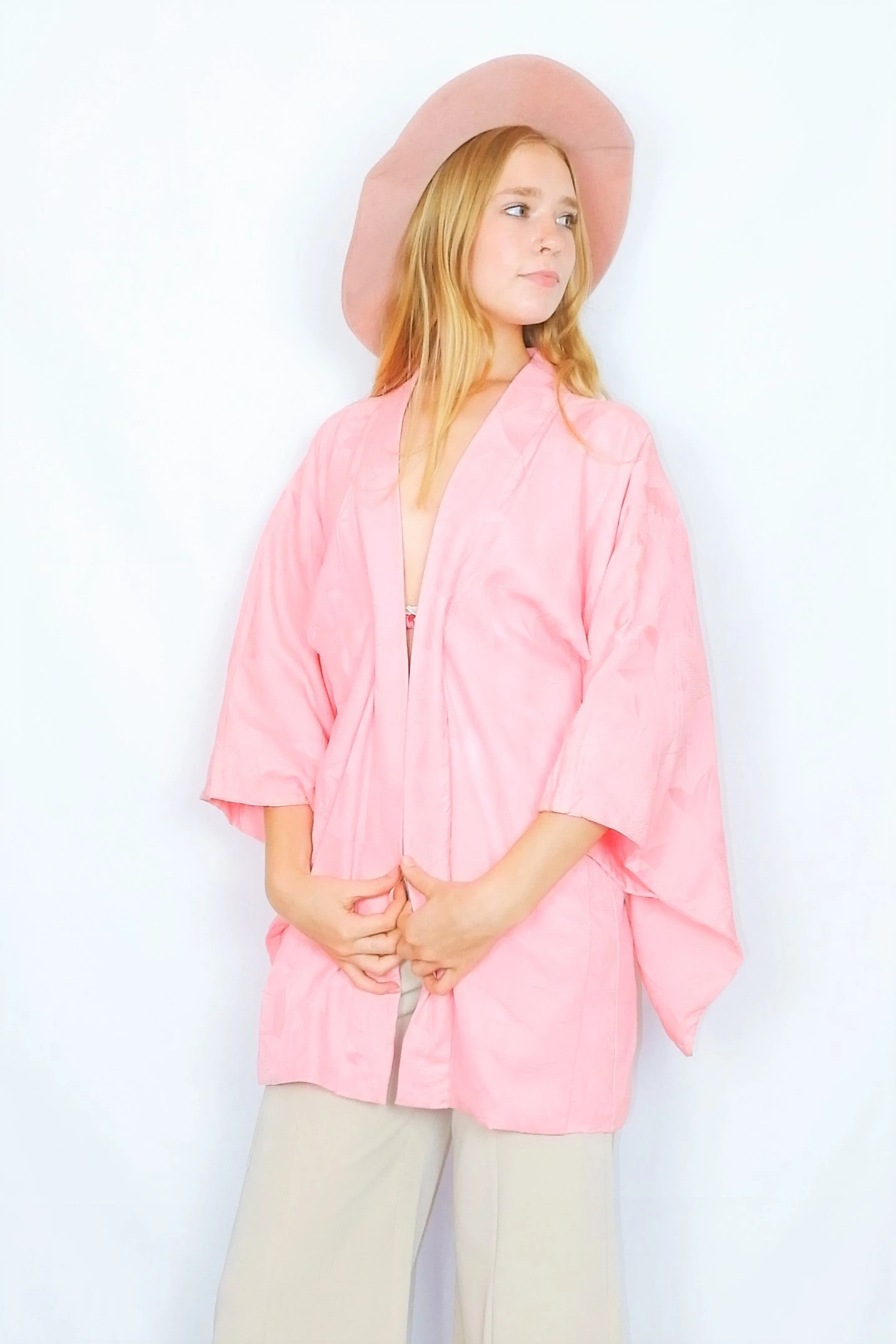 Authentic vintage kimono with a beautifully textured flora pattern in a bright, sweet shade of pink