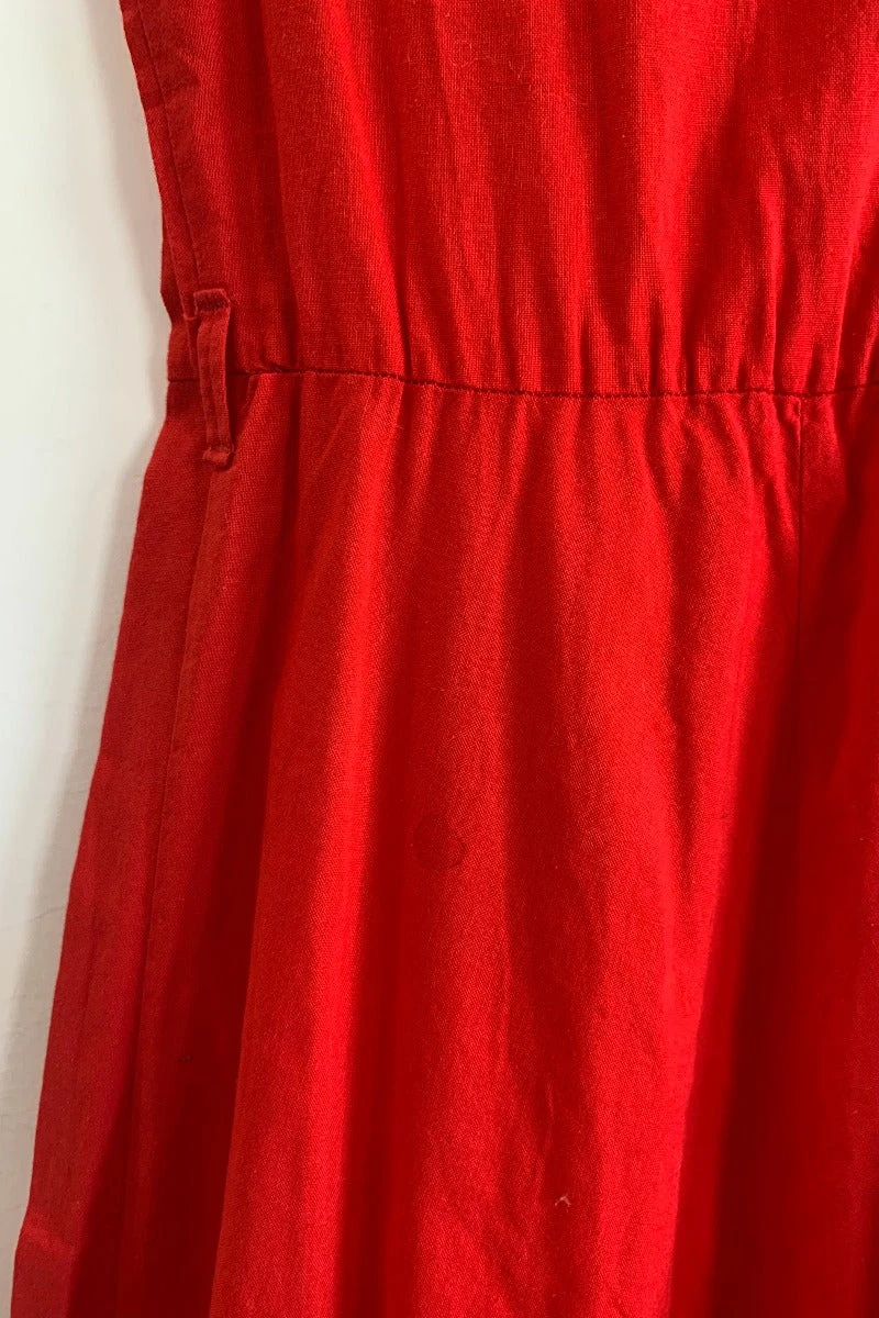 Cute midi red sleeveless sundress in a bright poppy red. Has frill broderie anglaise detailing at the arms and neckline with a tie front. A sweet throw on dress, pair with a belt to spice it up a bit, would also look really cool with some boots and gold hoops!