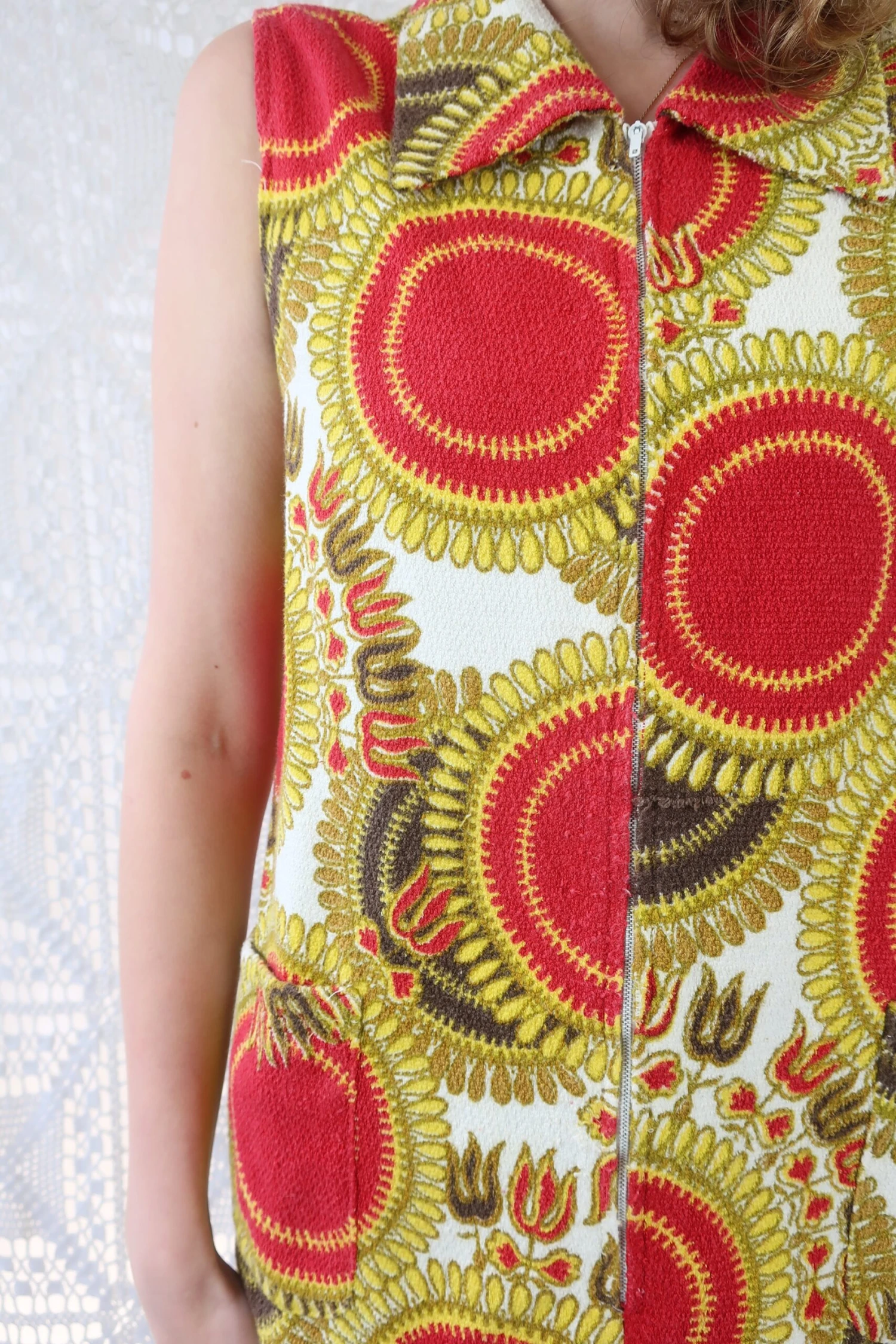 Quirky vintage mini dress with a cute sunflower mandala design, pointed collar, pockets and a front zip detail. Alternatively, could be worn as a top if taller (pictured).