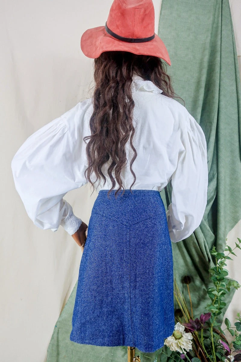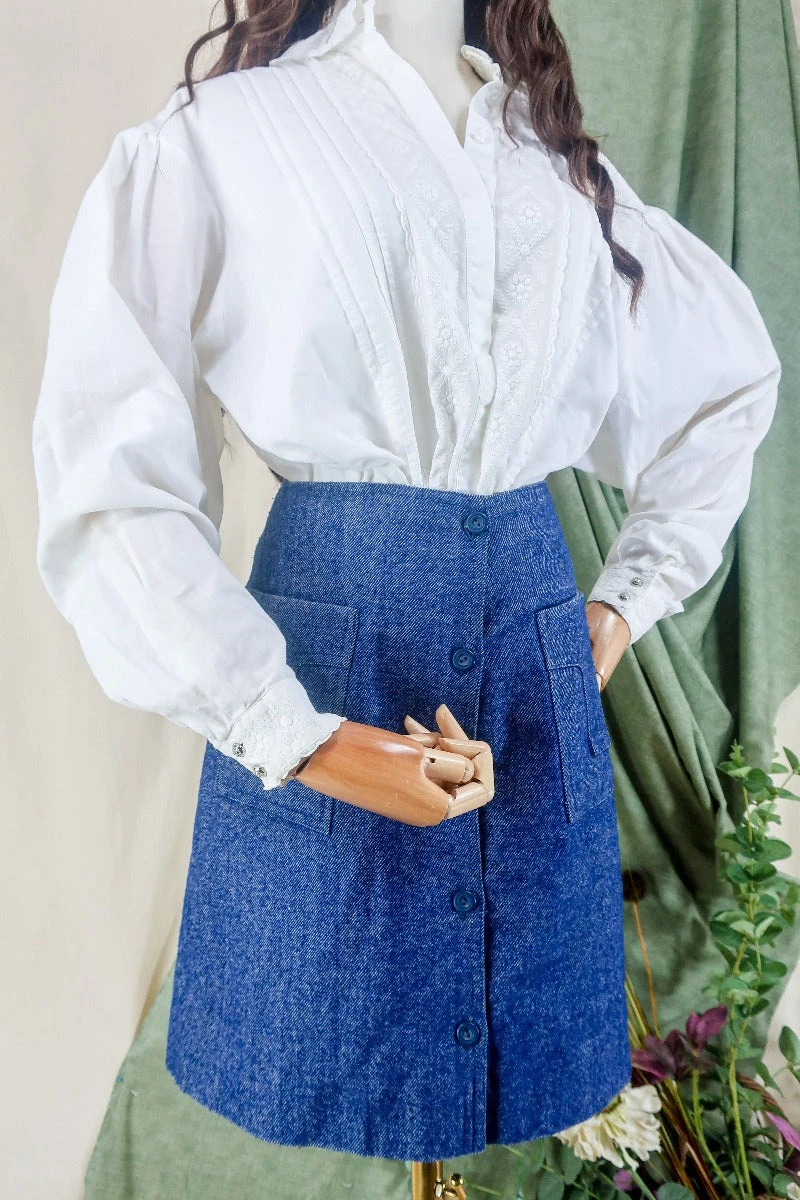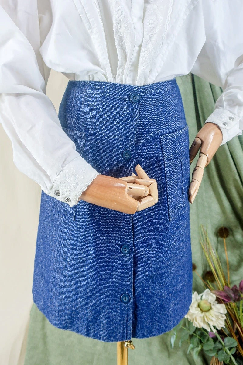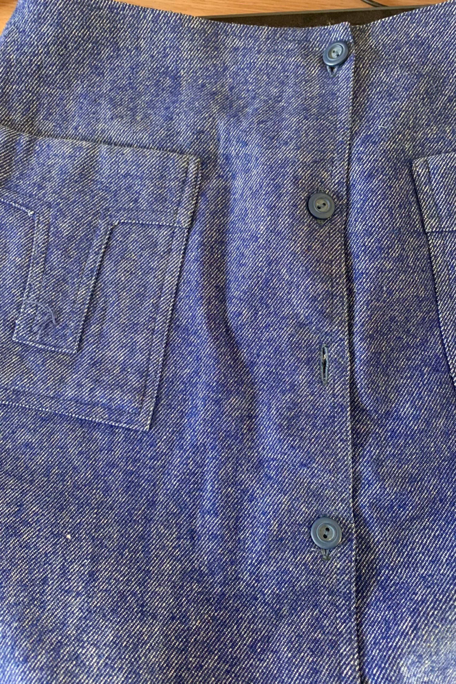 The cutest skirt! Fully lined inside made from what looks and feels like a woven wool fabric on the outside. A sweet a-line style shape which is super flattering and unique detailing on the front pockets. Wear with chunky knitwear, long leg boots and gold hoops!