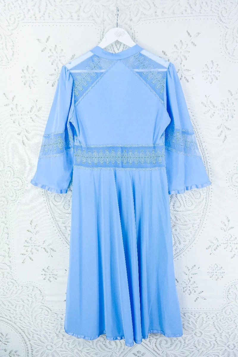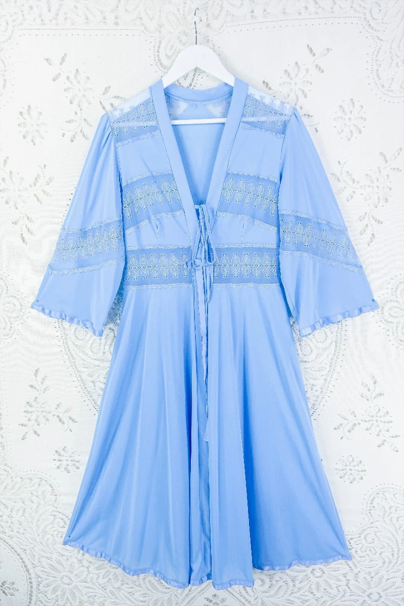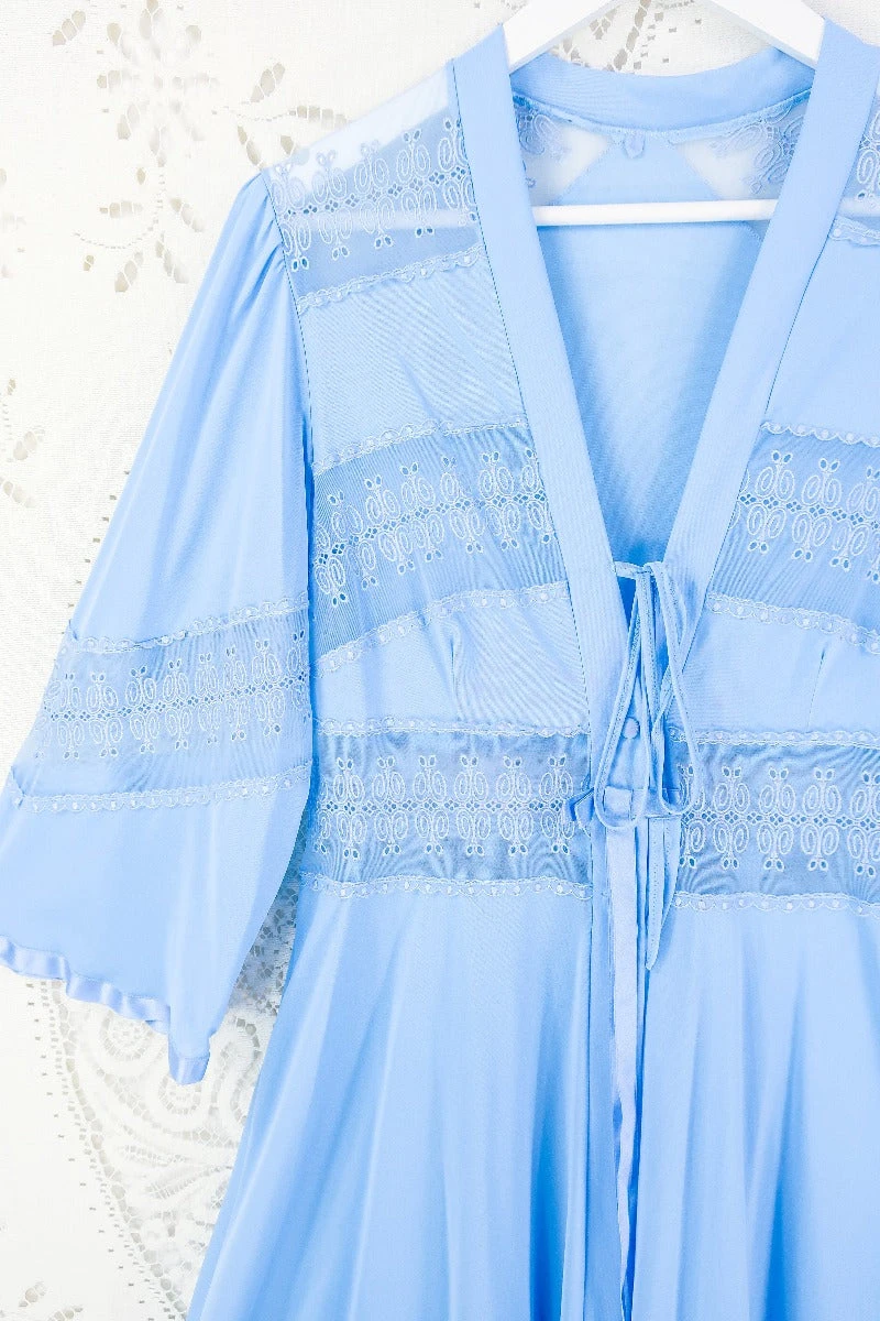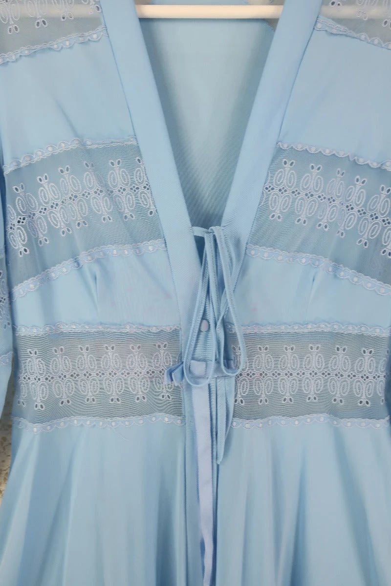 A gorgeous and graceful powdered blue house coat with broderie Anglaise detailing on the bodice and sleeves. A button up chest and a long floaty open skirt. It’t the perfect glam lounge wear or party layer!ย