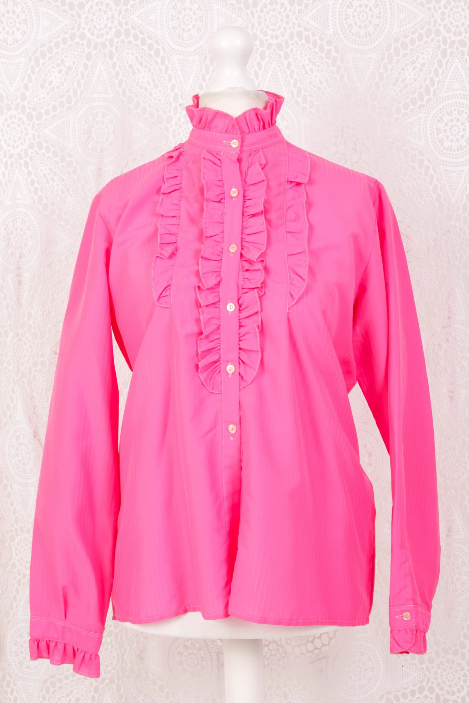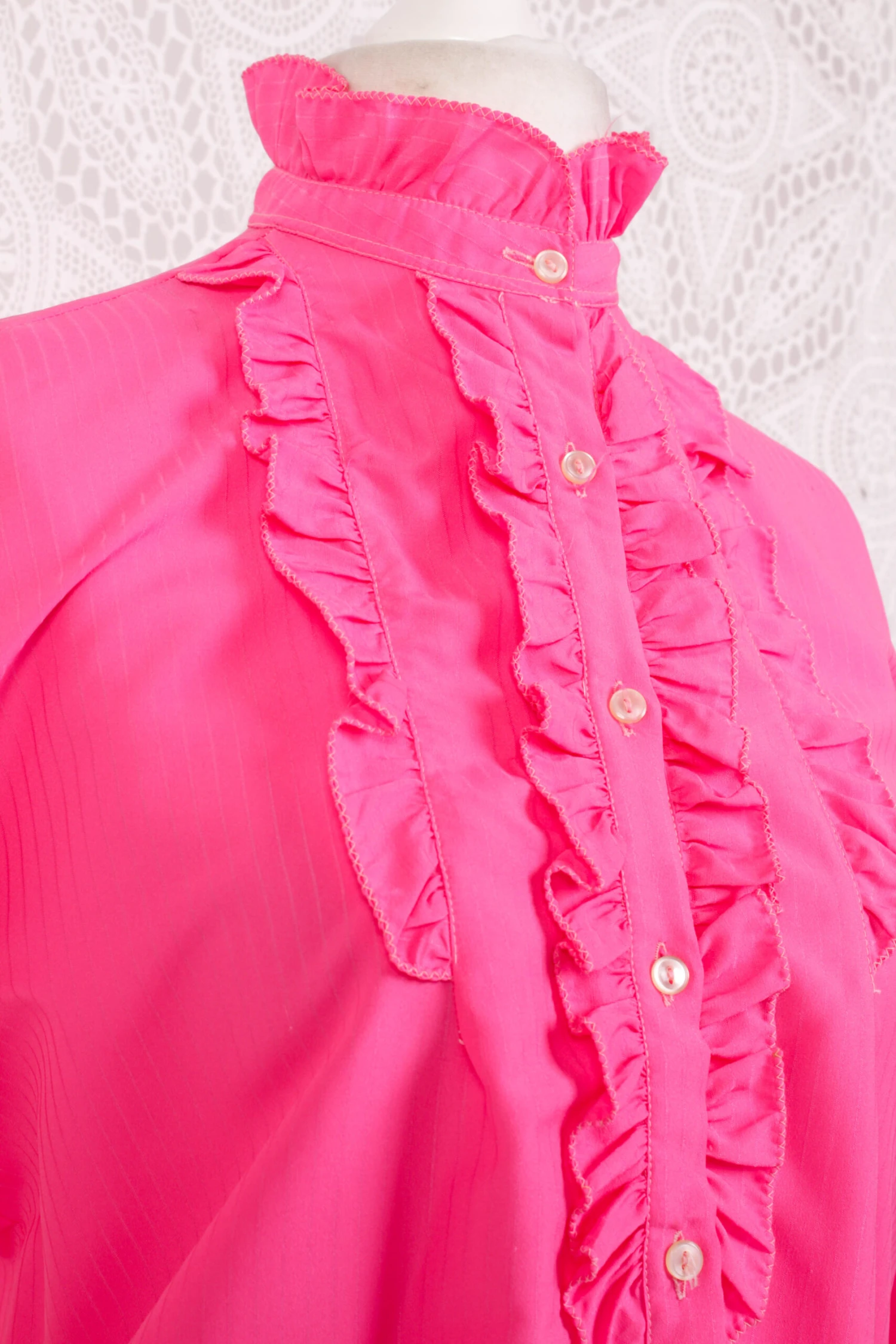 Vibrant bright pink vintage blouse with subtle stripes and frill details