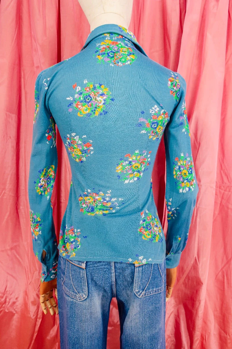 A cute retro 70’s shirt – very petite! A gorgeous cornflower blue tone with a bright coloured painted motif depicting bursts of wildflowers. A classic dagger collar and fitted shape.