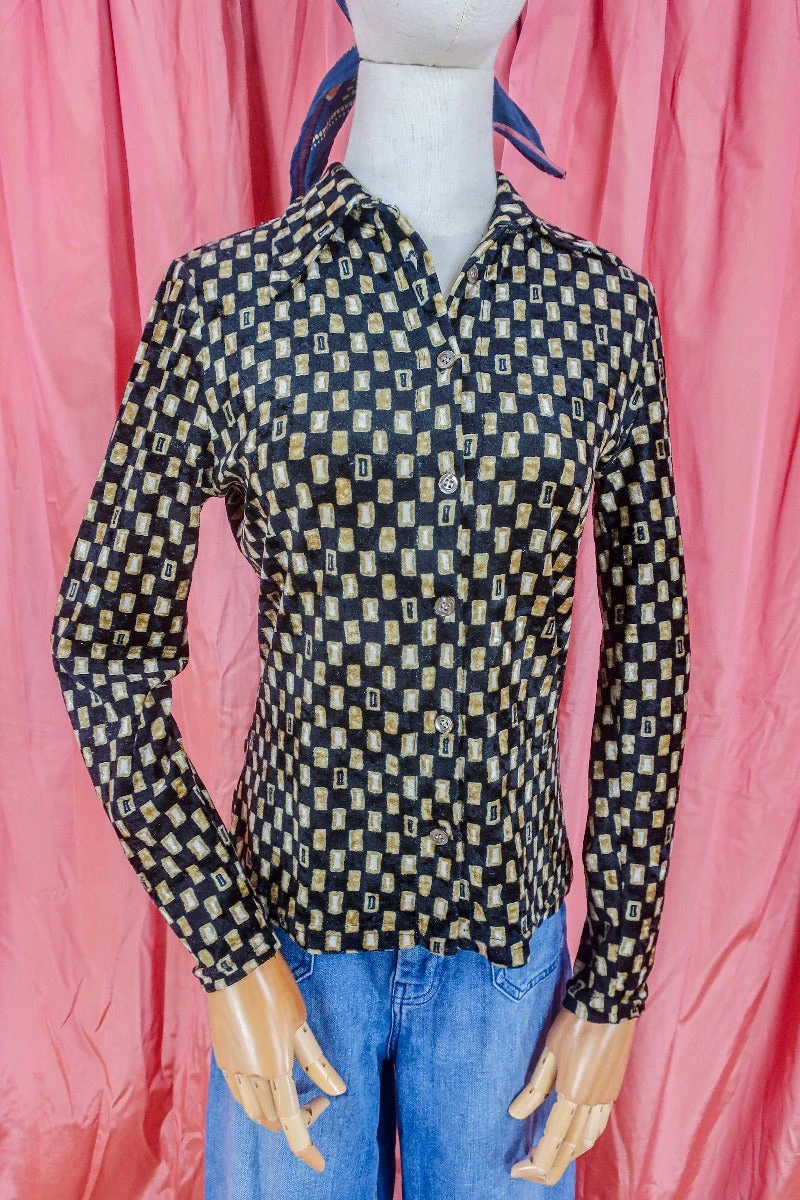 A very retro black and bronze checkered art deco tile print shirt. A 70’s pointed collar, ever so slightly fitted shape gives an old style silhouette. This shirt is great to throw on with your favourite pair of jeans!