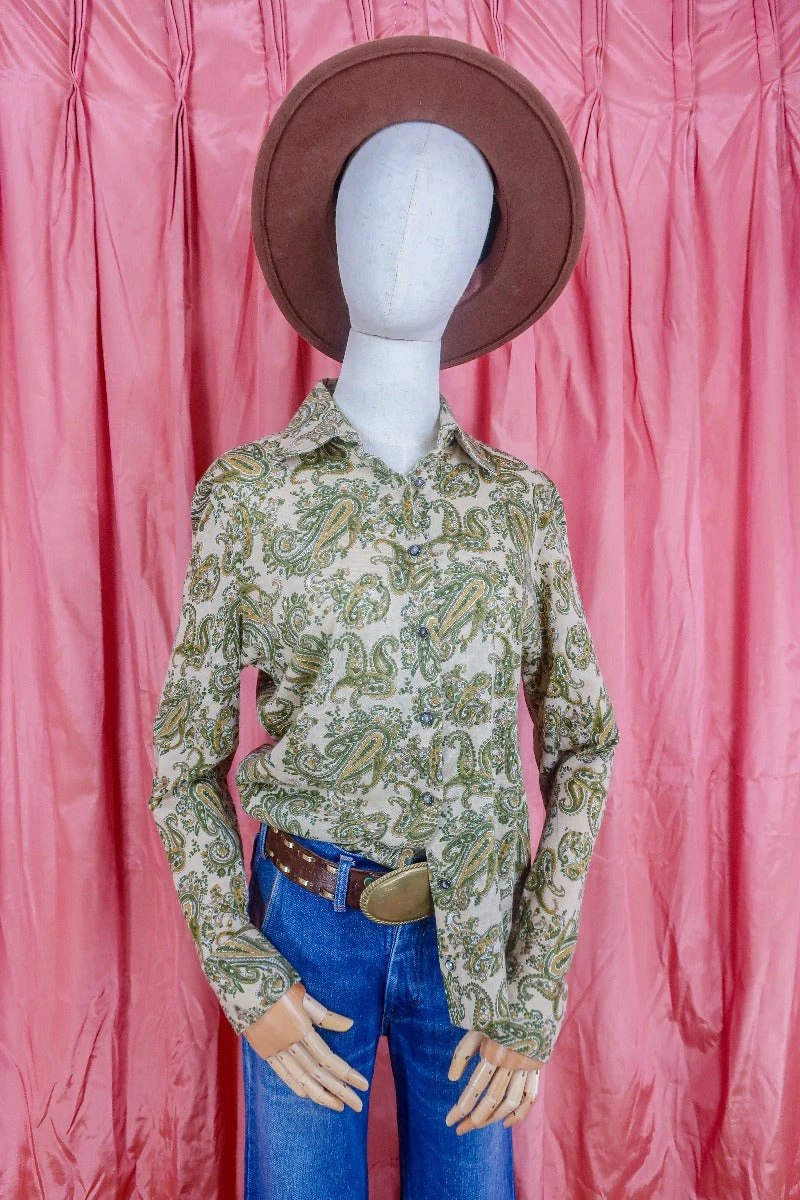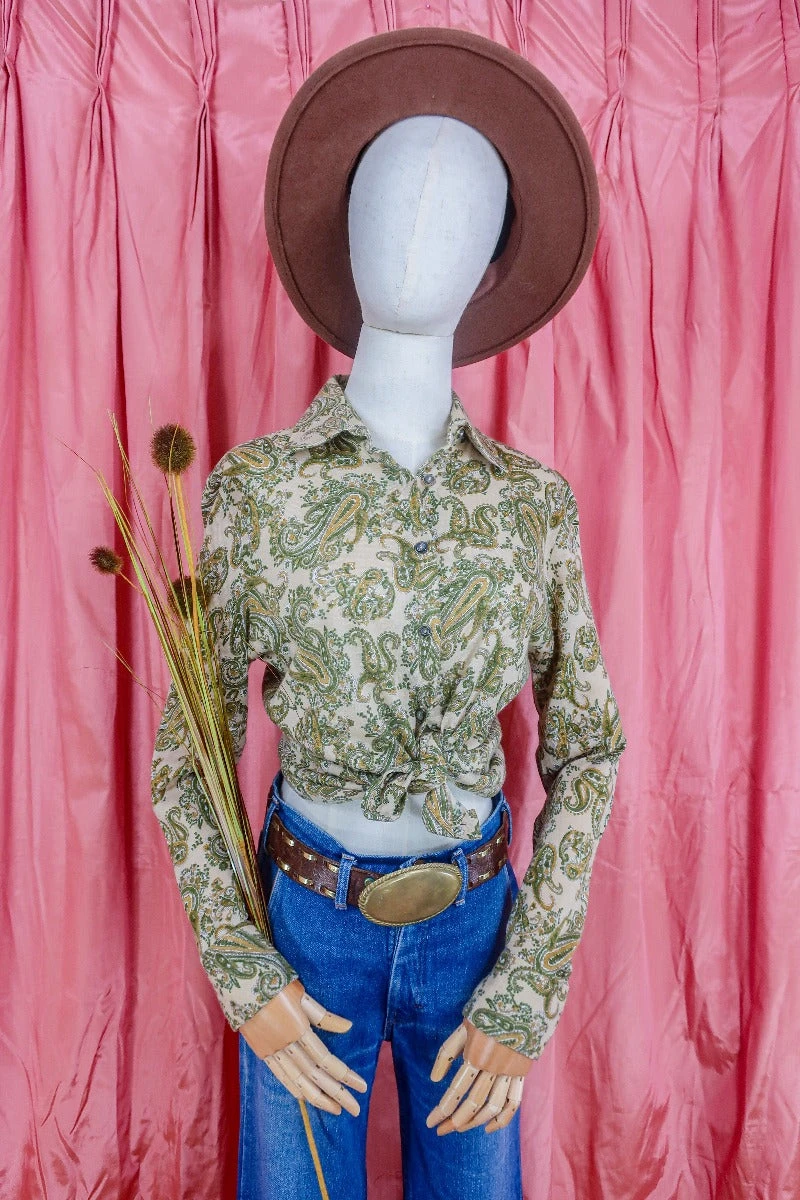 A lovely earthy tonal green intricate and groovy paisley shirt. Super soft feeling with a button up front, slightly fitted 70’s shape and collar. Still a great neutral, moody tone, so perfect for layering and styling during the transitional months!