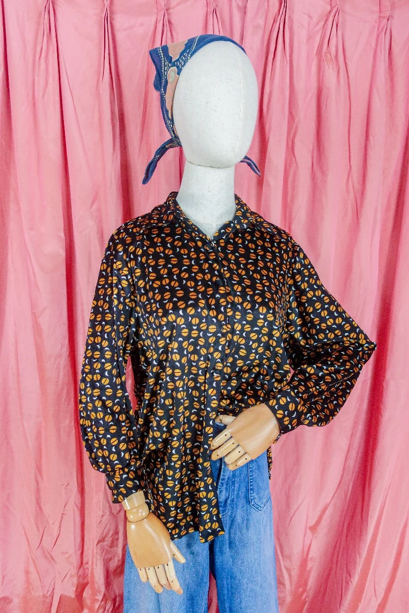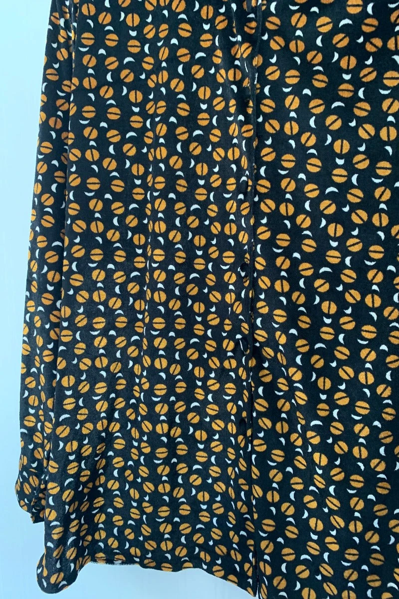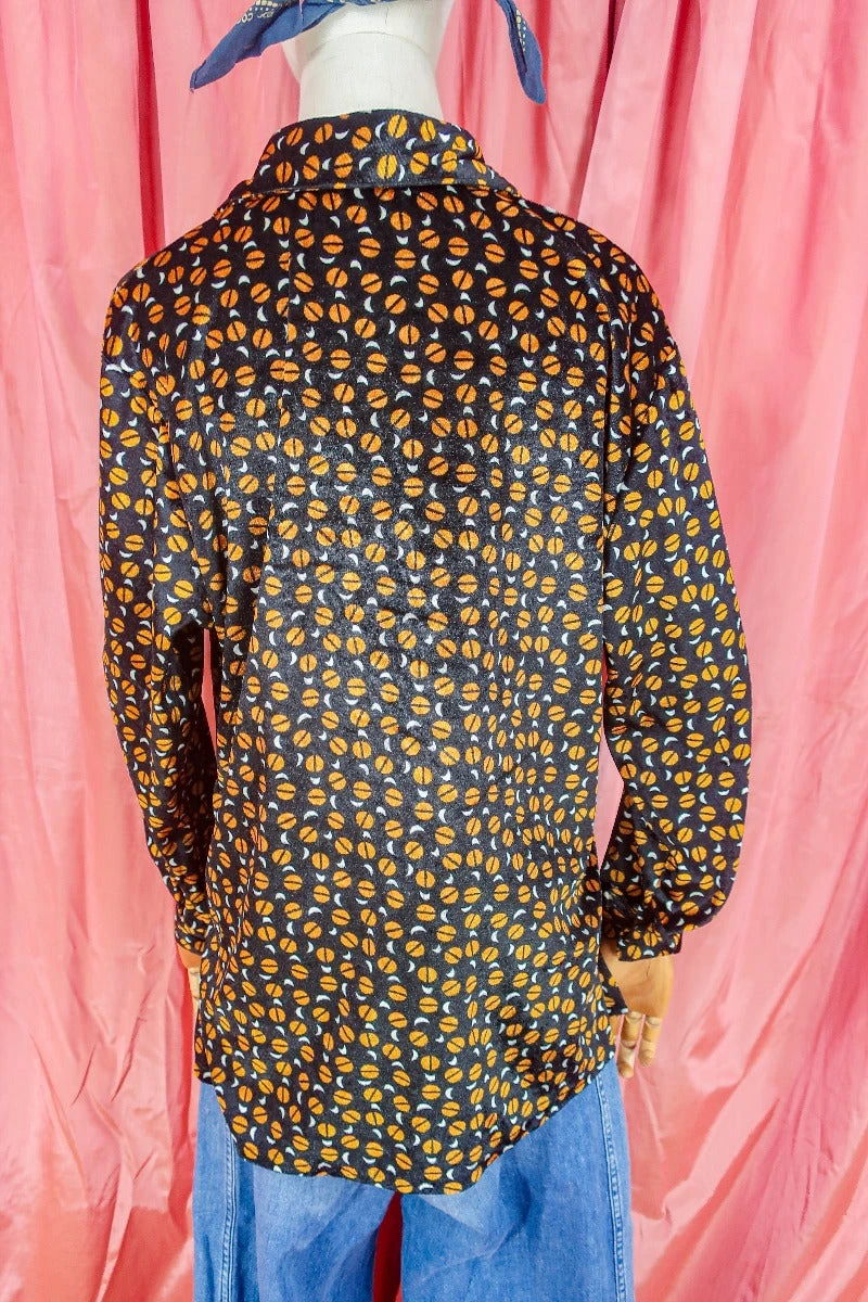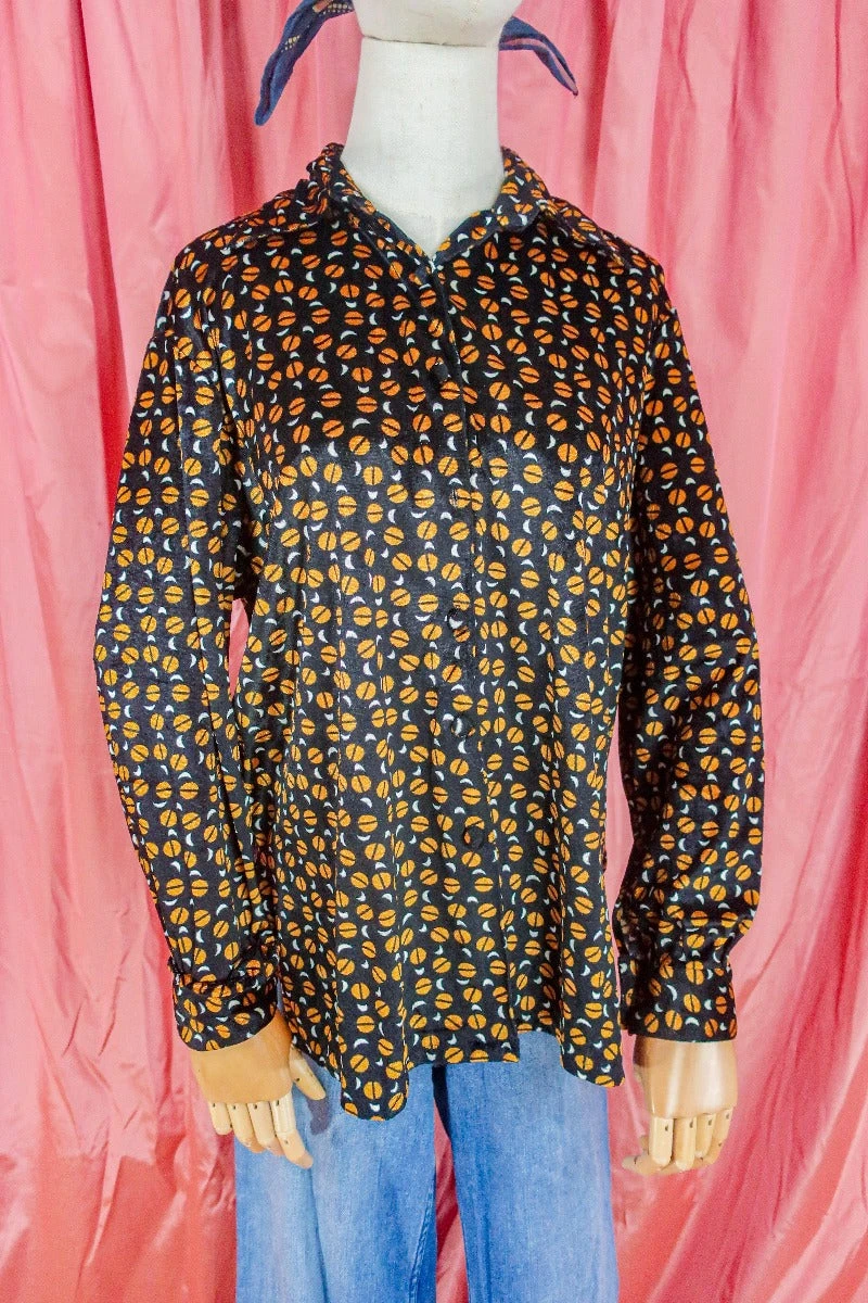 A cozy and very chic velvet shirt. Could be worn more fitted or oversized. Wear under or over layers or tie at the front to make it cropped – it’s perfect for styling! A retro rust and white circular tile and half moon print gives this shirt a moody but groovy autumnal feel!