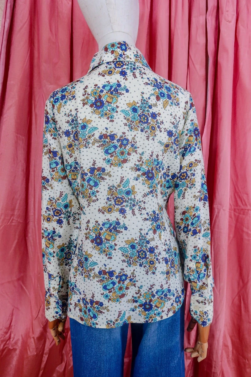 The sweetest retro shirt with an illustrated ditsy floral print in a turquoise, indigo, mustard and russet colourway against a salt white base colour. With a pointed collar and classic 70’s fitted shape.