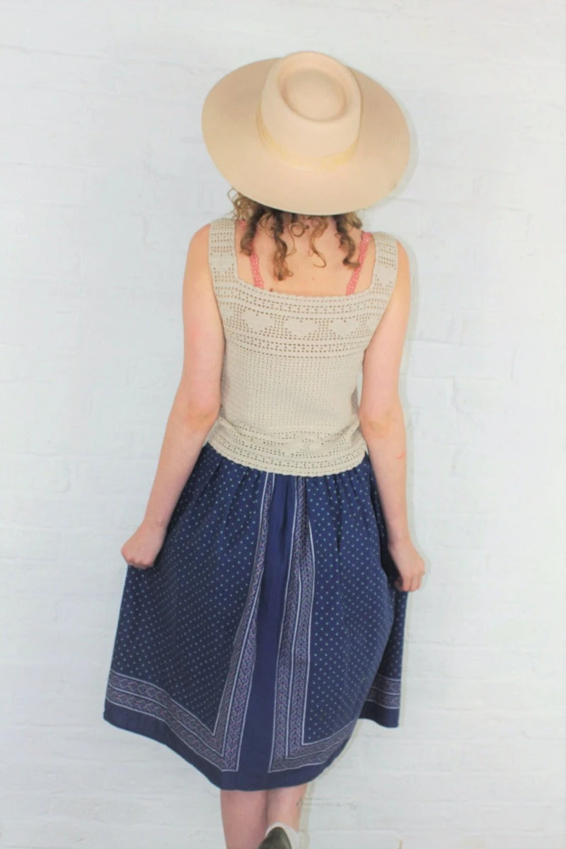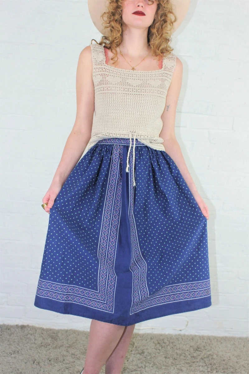 Really sweet deep blue lightweight floral skirt, it has the cutest ditsy daisy print and wildflower floral around the borders. It is pictured with the zip at the back but it can be worn at the side so the pattern is shown differently. The perfect folky skirt!