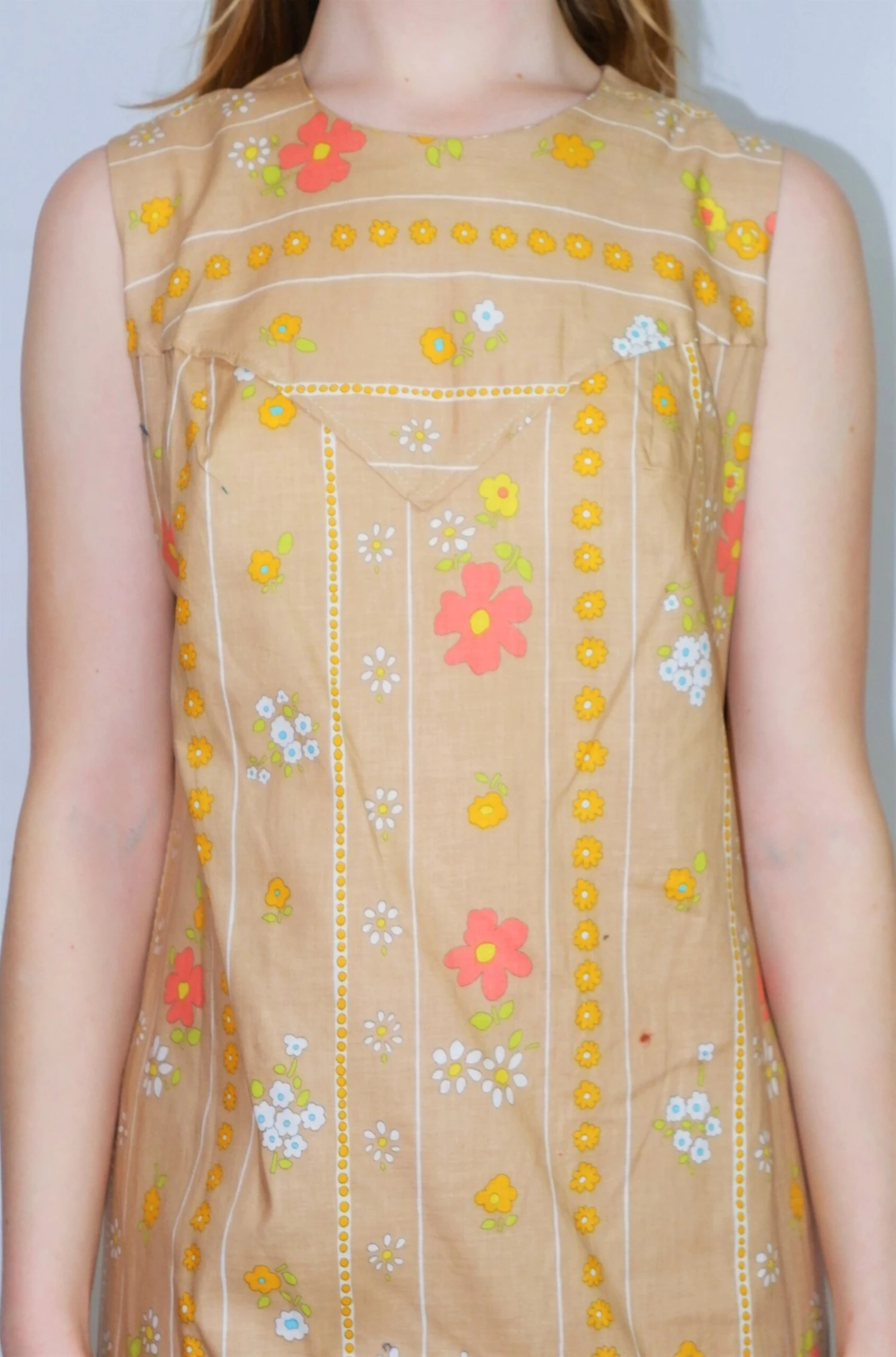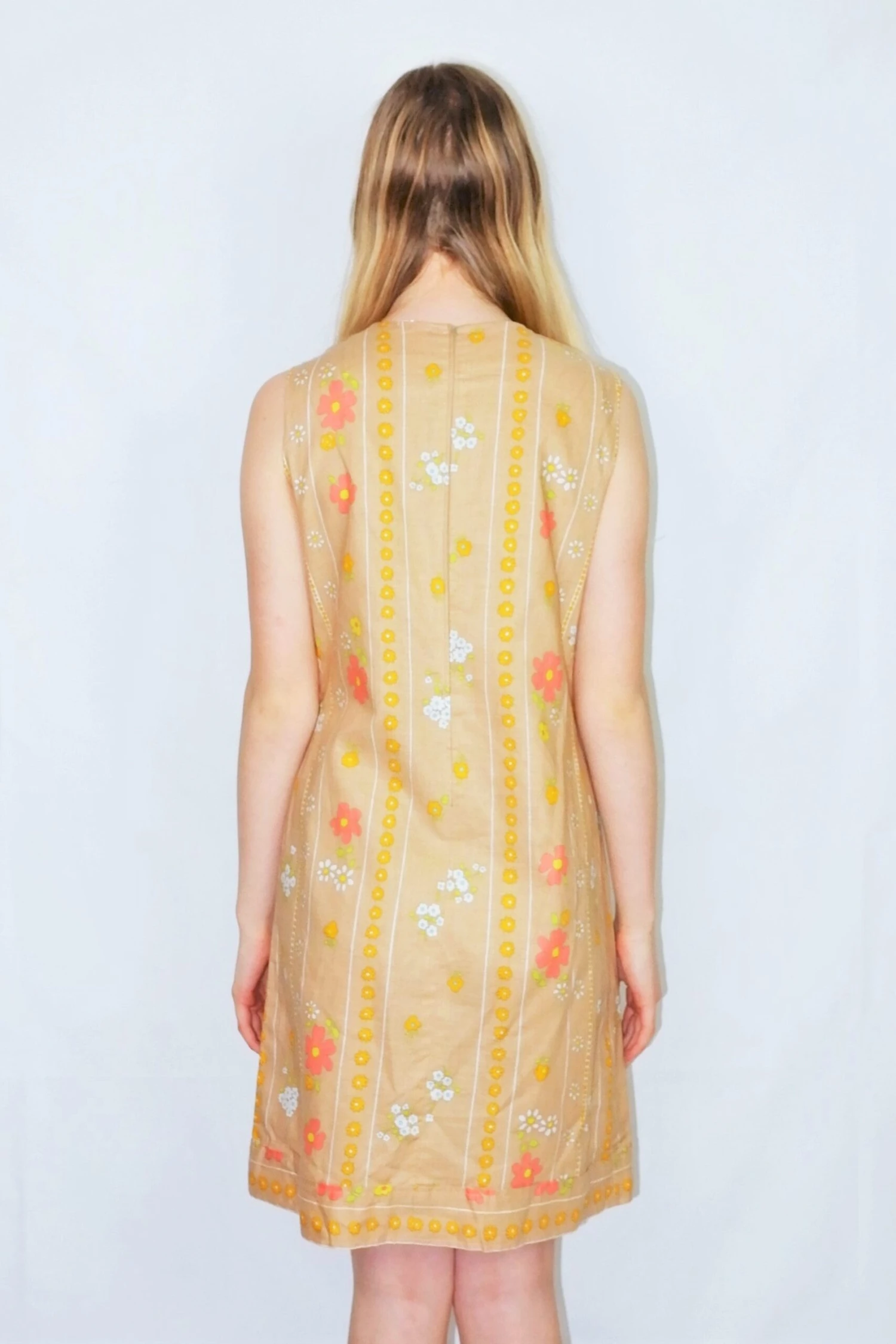Cute sleeveless vintage mini dress with a shift dress cut and retro floral print that evokes a 60’s gogo style – would look amazing with a pair of boots!