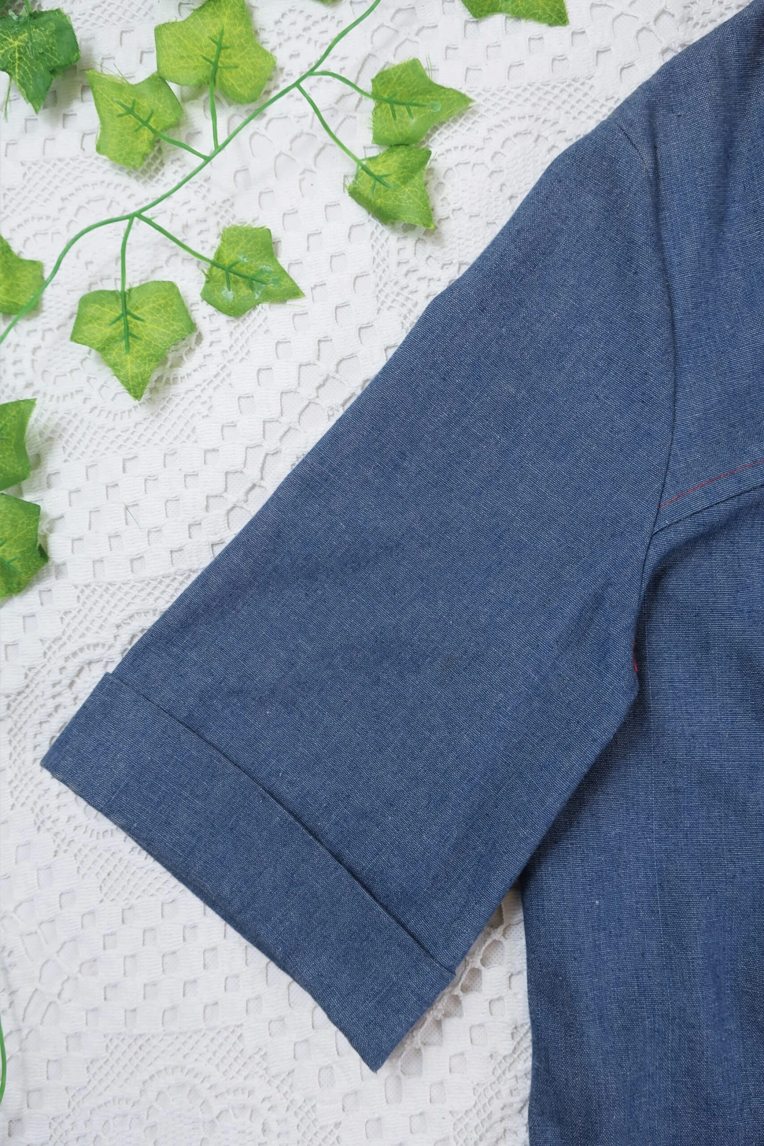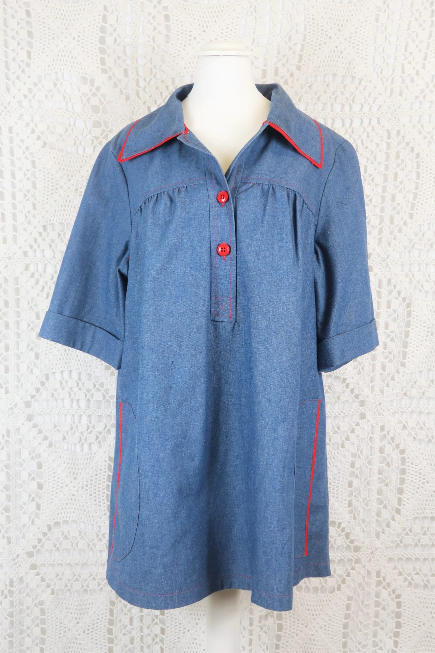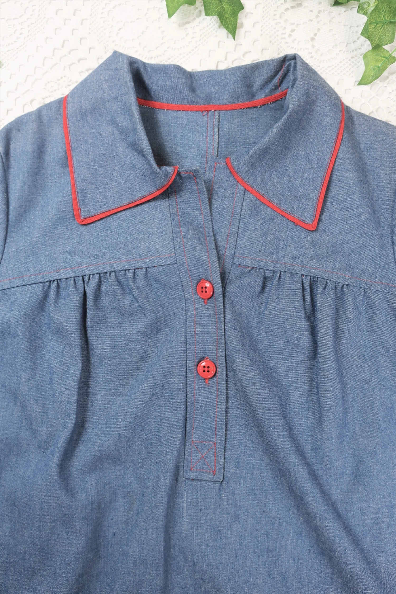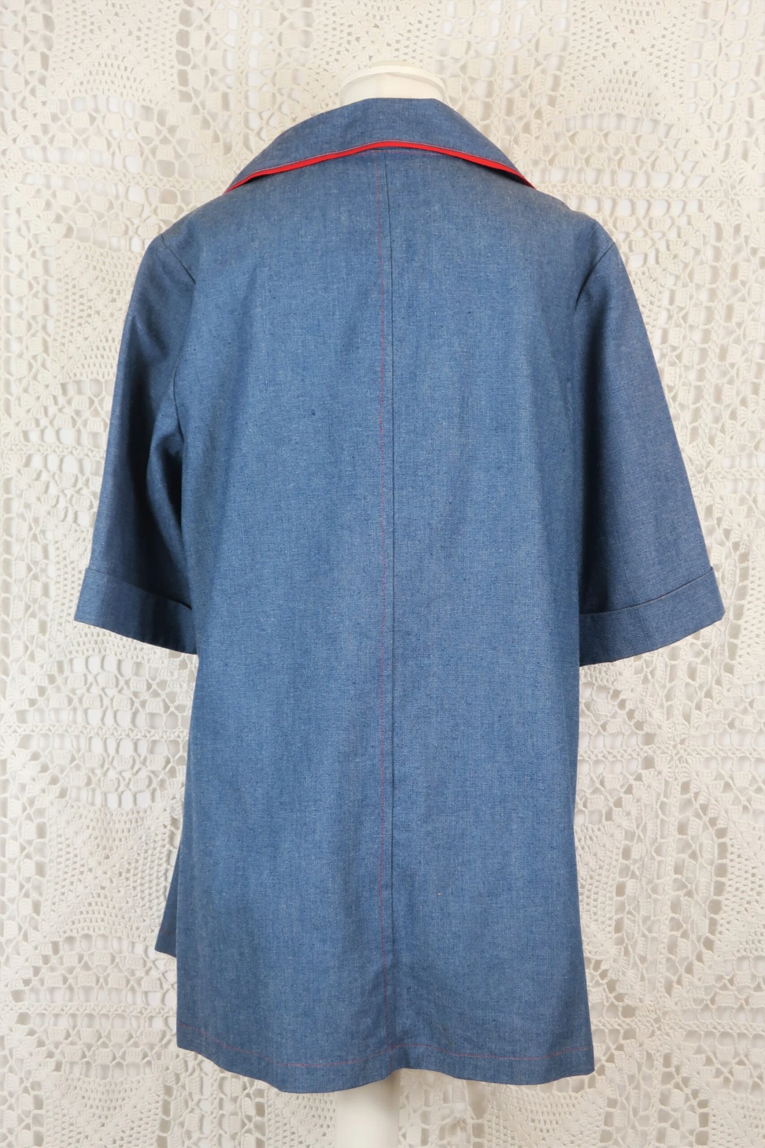 Vintage tunic top made from denim-styled linen, with red trim and buttons that make the whole piece pop.
