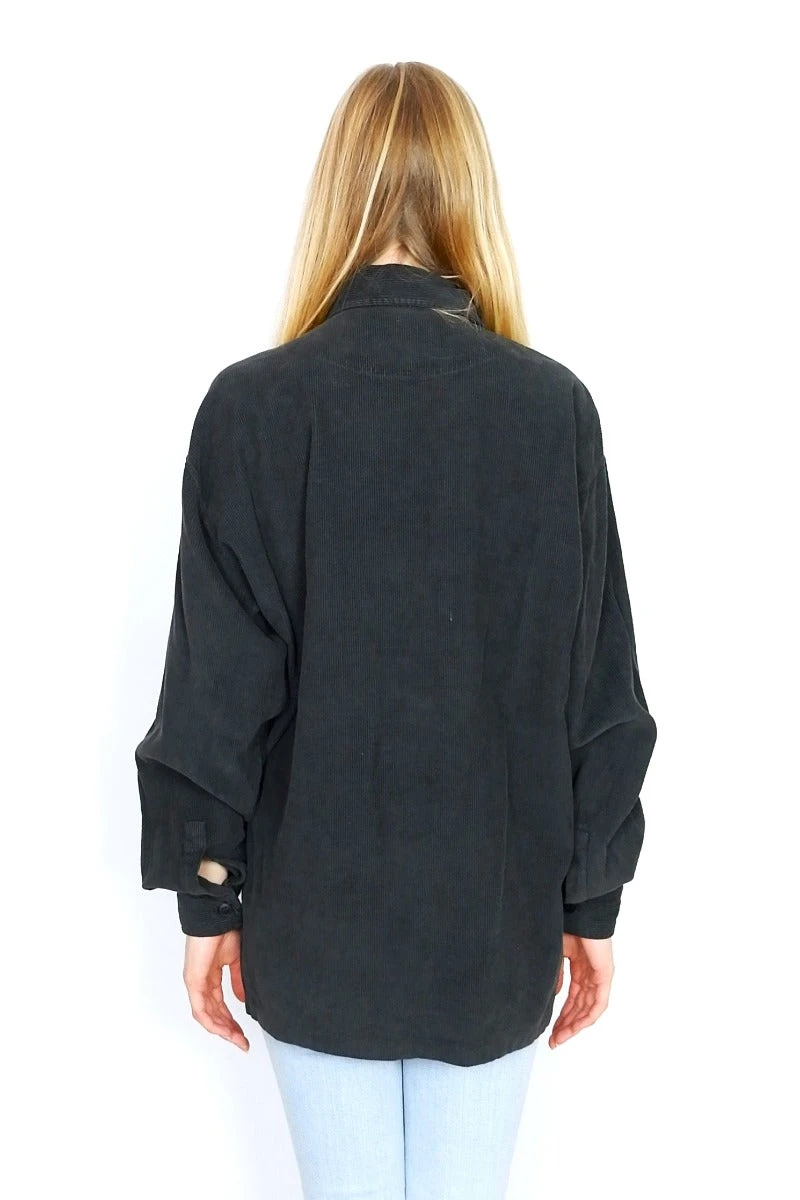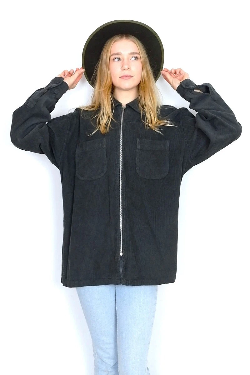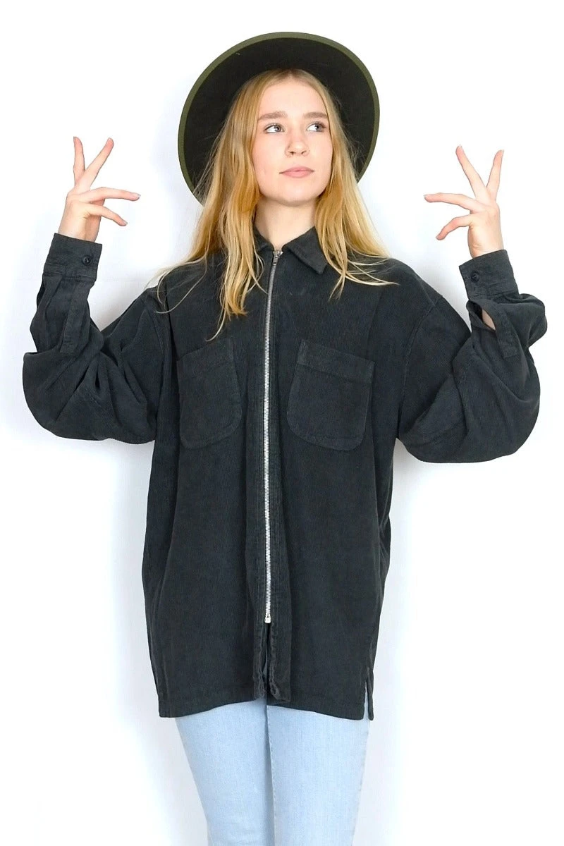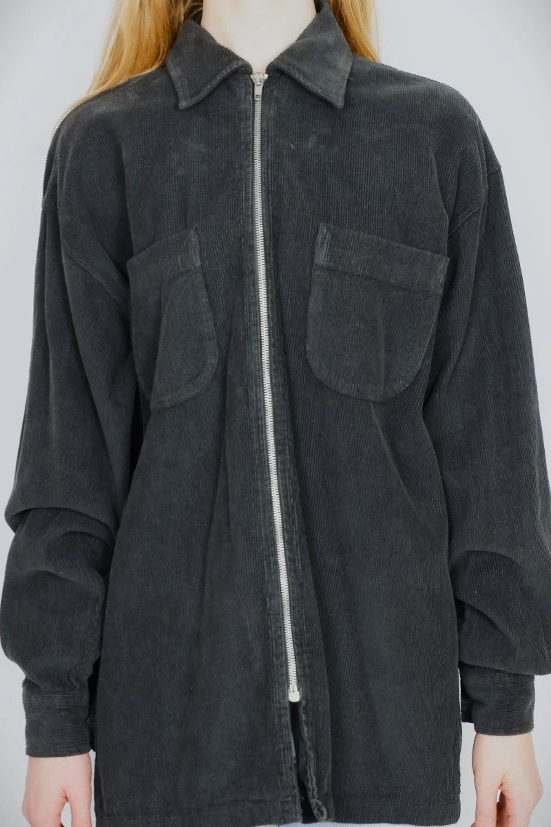 Classic charcoal grey corduroy shirt. A staple for every wardrobe and such an easy throw on piece. Can be worn as a shirt or layered up as a lightweight jacket. A zip up front and two handy pockets – also unisex!
